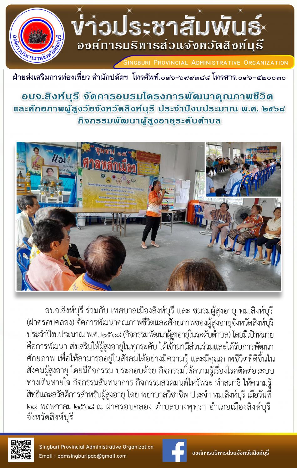 อบจ.สิงห์บุรี จัดโครงการพัฒนาคุณภาพชีวิตและศักยภาพผุ้สูงอายุจังหวัดสิงห์บุรี ประจำปีงบประมาณพ.ศ.2568 กิจกรรมพัฒนาผู้สูงอายุในระดับตำบล [29 พฤษภาคม 2568]