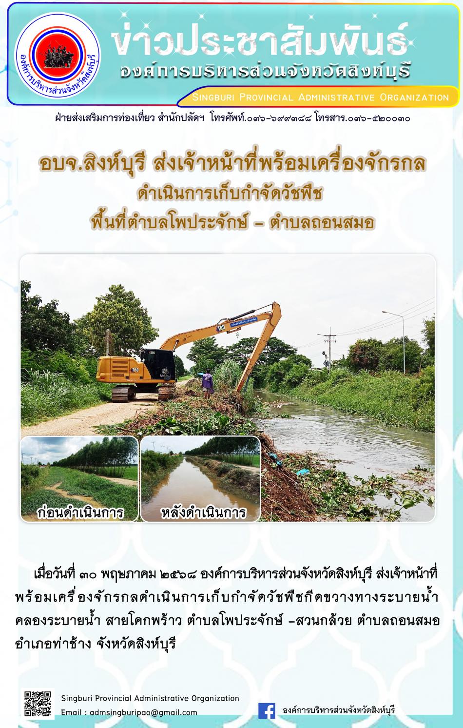 อบจ.สิงห์บุรี ส่งเจ้าหน้าที่พร้อมเครื่องจักรกล เก็บกำจัดวัชพืช พื้นที่ตำบลโพประจักษ์ - ตำบลถอนสมอ [30 พฤษภาคม 2568]