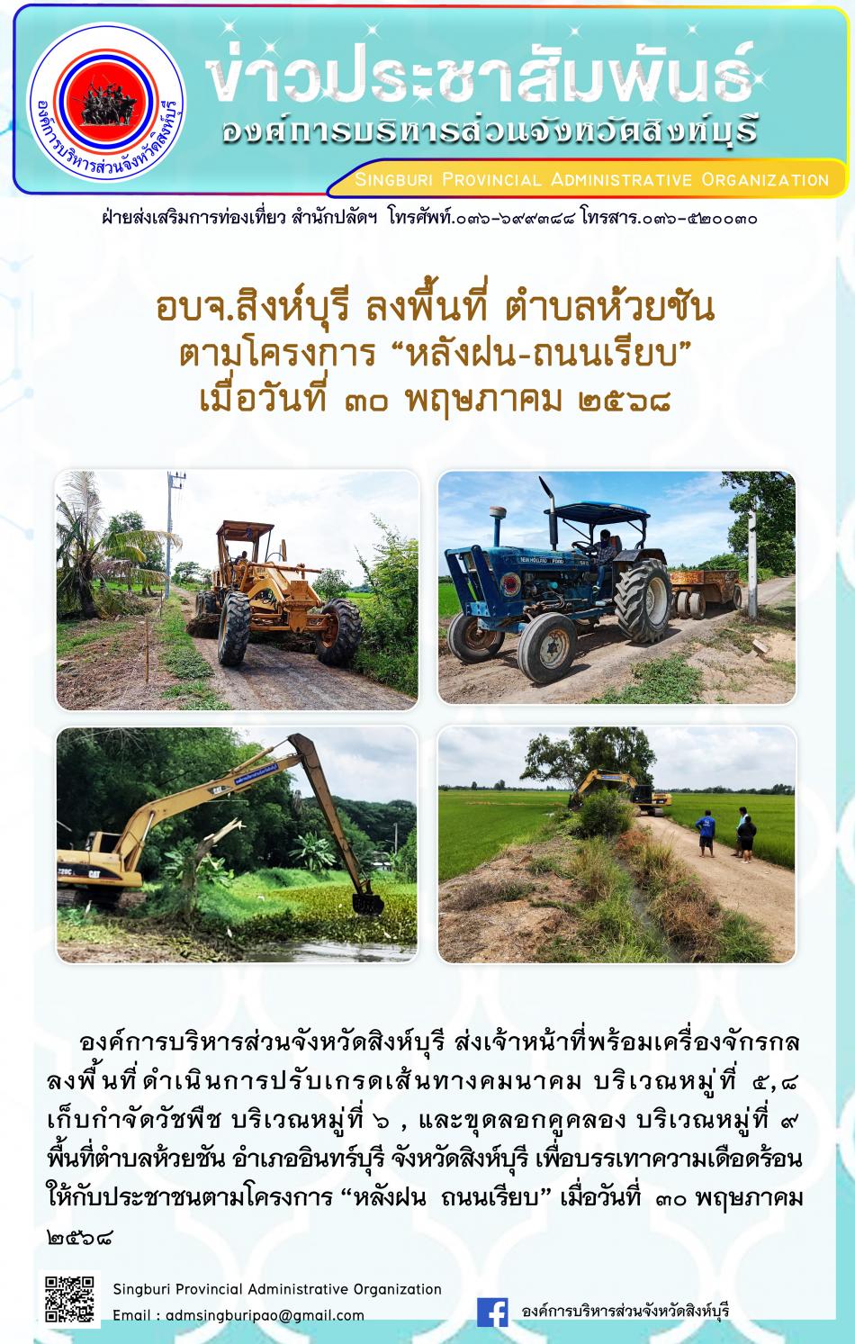 อบจ.สิงห์บุรี ลงพื้นที่ ตำบลห้วยชัน ตามโครงการ "หลังฝน - ถนนเรียบ" [30 พฤษภาคม 2568]