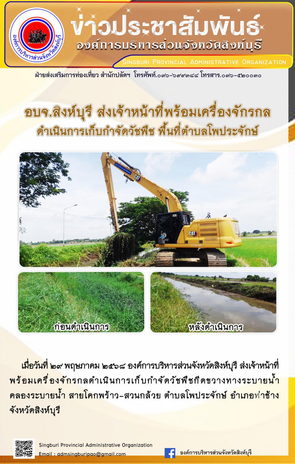 อบจ.สิงห์บุรี ส่งเจ้าหน้าที่พร้อมเครื่องจักรกล เก็บกำจัดวัชพืช พื้นที่ตำบลโพประจักษ์ [29 พฤษภาคม 2568]