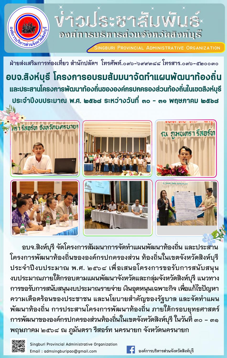อบจ.สิงห์บุรี โครงการอบรมสัมมนาจัดทำแผนพัฒนาท้องถิ่นและประสานโครงการพัฒนาท้องถิ่นขององค์กรปกครองส่วนท้องถิ่นในเขตสิงห์บุรี ประจำปีงบประมาณ พ.ศ.2568 [30 พฤษภาคม 2568]
