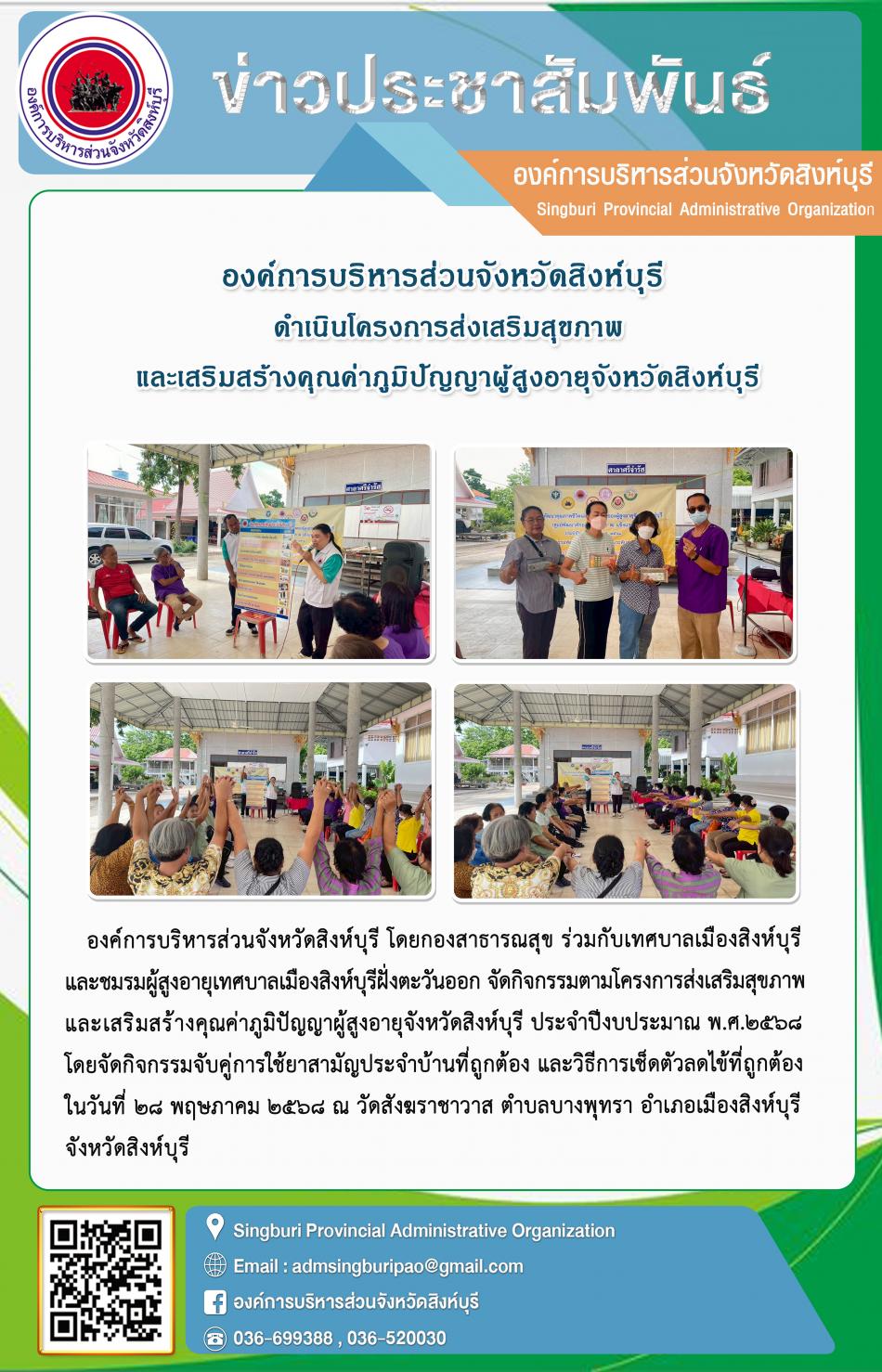 อบจ.สิงห์บุรี ดำเนินกิจกรรมส่งเสริมสุขภาพ สร้างจิตใจที่แจ่มใสให้กับผู้สุงอายุ ด้วยกิจกรรมทางสังคม [28 พฤษภาคม 2568]