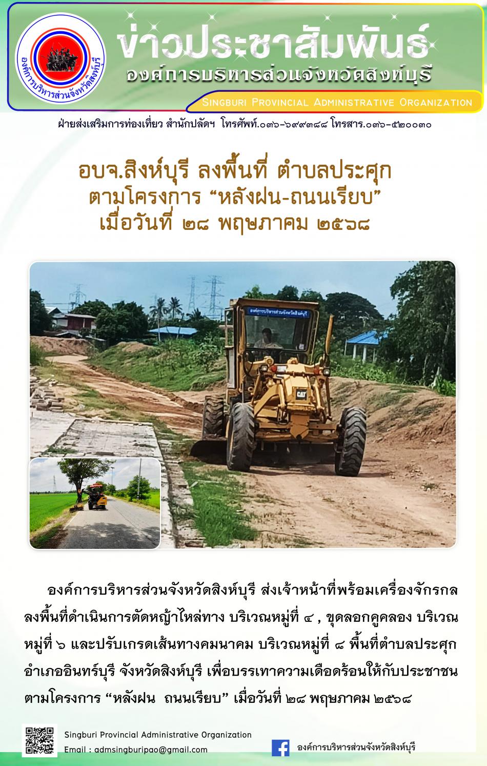 อบจ.สิงห์บุรี ลงพื้นที่ ตำบลประศุก ตามโครงการ "หลังฝน - ถนนเรียบ" [27 พฤษภาคม 2568]