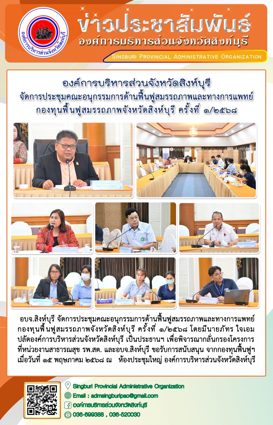 องค์การบริหารส่วนจังหวัดสิงห์บุรี จัดการประชุมคณะอนุกรรมการด้านฟื้นฟูสมรรถภาพและทางการแพทย์กองทุนฟื้นฟูสมรรถภาพจังหวัดสิงห์บุรี ครั้งที่ 1/2568 [15 พฤษภาคม 2568]