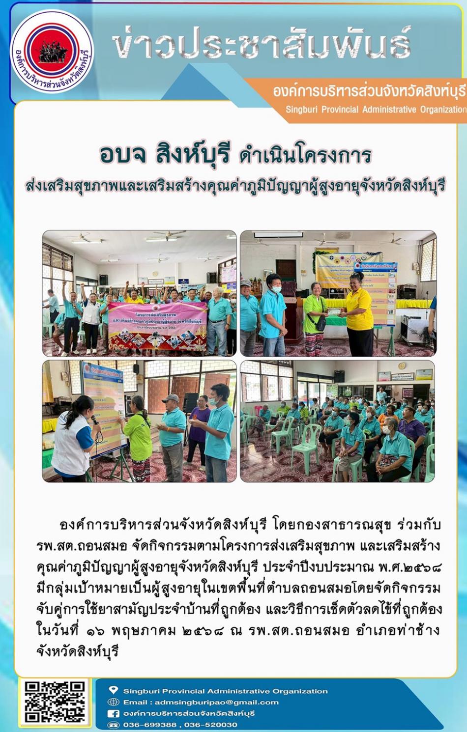 อบจ.สิงห์บุรี ดำเนินโครงการส่งเสริมสุขภาพและเสริมสร้างคุณค่าภูมิปัญญาผู้สูงอายุจังหวัดสิงห์บุรี [16 พฤษภาคม 2568]