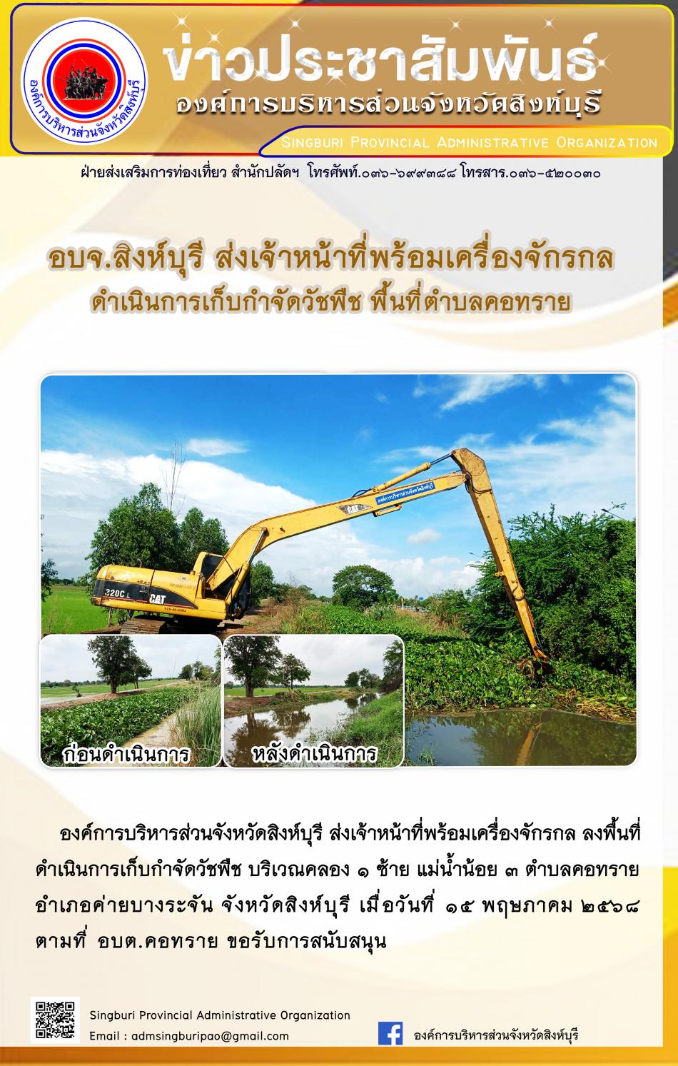 อบจ.สิงห์บุรี ส่งเจ้าหน้าที่พร้อมเครื่องจักรกล เก็บกำจัดวัชพืช พื้นที่ตำบลคอทราย [15 พฤษภาคม 2568]