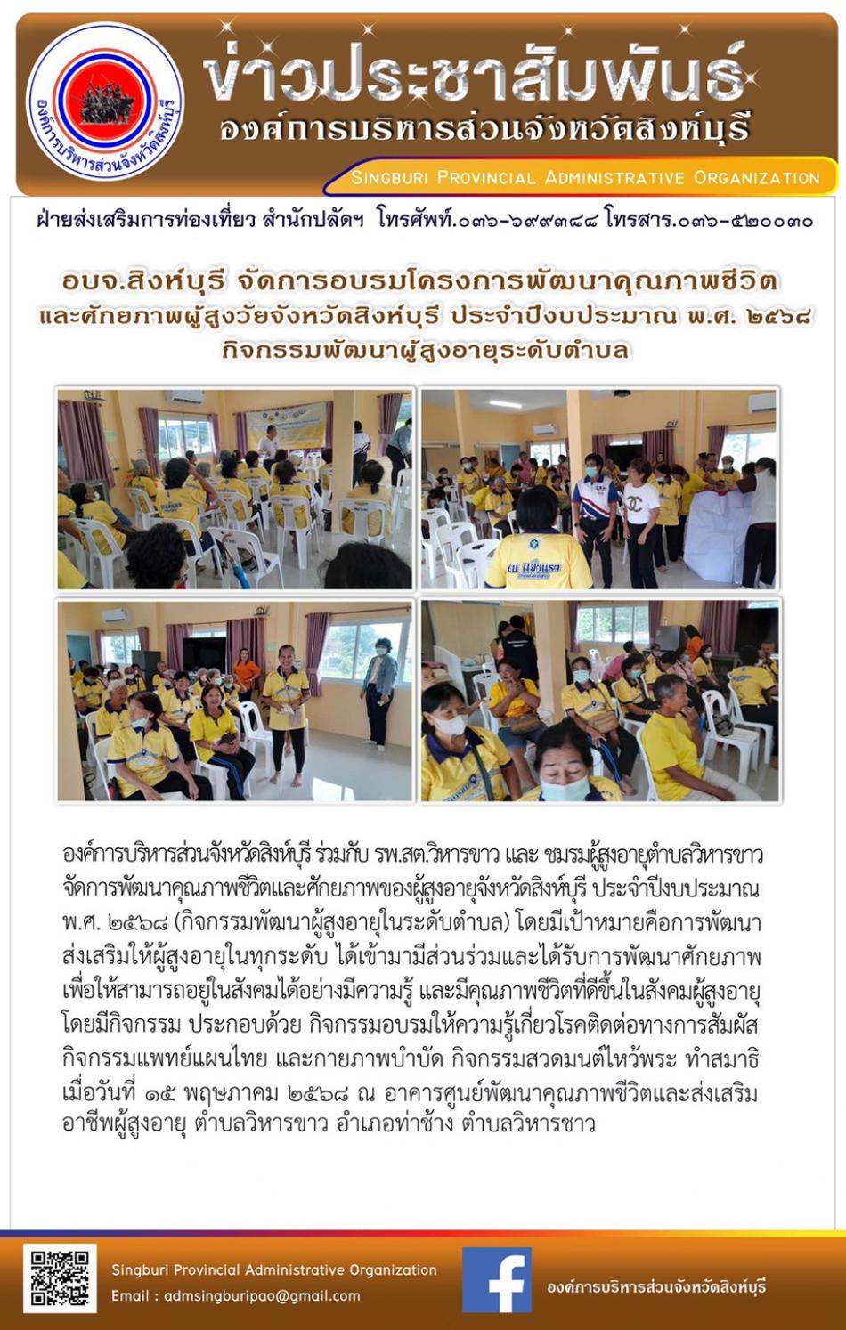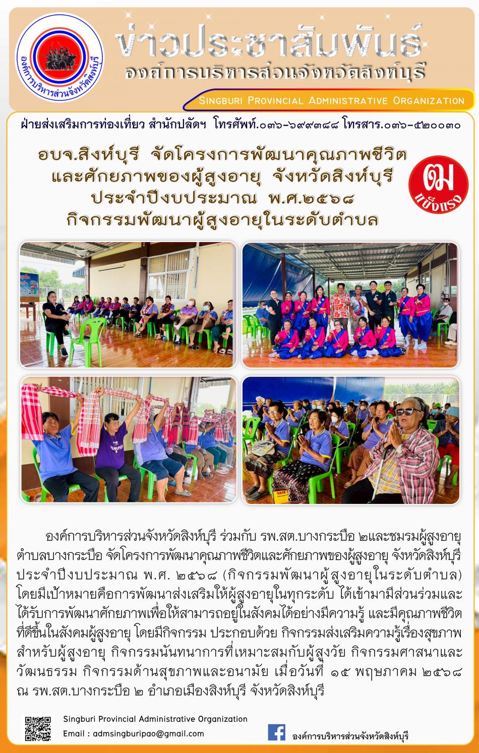 อบจ.สิงห์บุรี จัดโครงการพัฒนาคุณภาพชีวิตและศักยภาพผุ้สูงอายุจังหวัดสิงห์บุรี ประจำปีงบประมาณพ.ศ.2568 กิจกรรมพัฒนาผู้สูงอายุในระดับตำบล [15 พฤษภาคม 2568]
