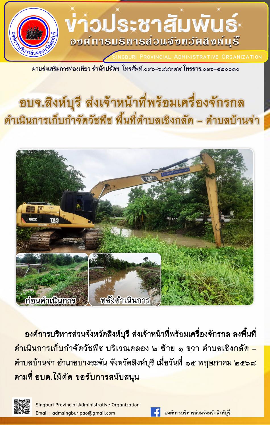 อบจ.สิงห์บุรี ส่งเจ้าหน้าที่พร้อมเครื่องจักรกล เก็บกำจัดวัชพืช พื้นที่ตำบลเชิงกลัด - ตำบลบ้านจ่า [15 พฤษภาคม 2568]