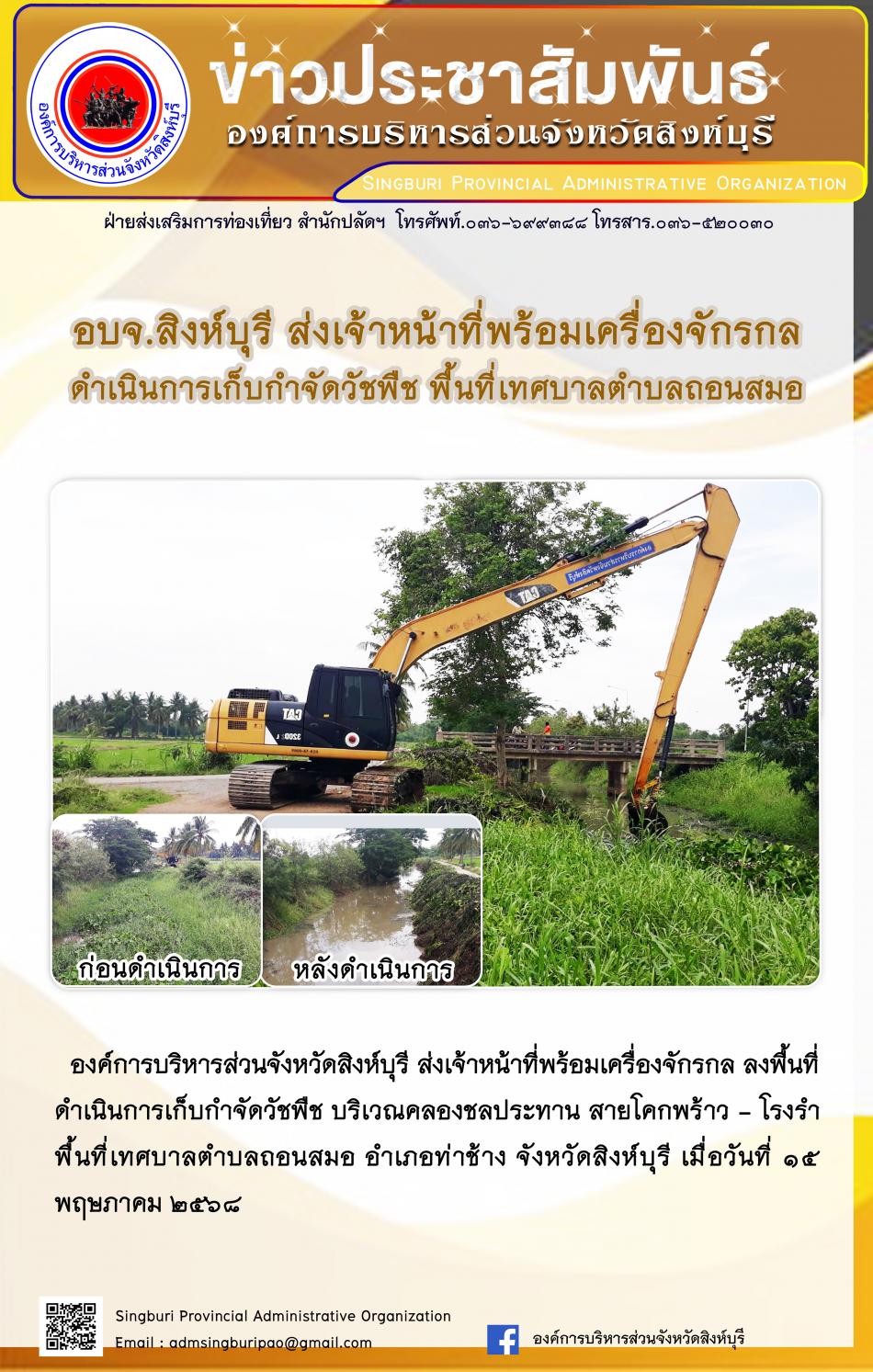 อบจ.สิงห์บุรี ส่งเจ้าหน้าที่พร้อมเครื่องจักรกล เก็บกำจัดวัชพืช พื้นที่เทศบาลตำบลถอนสมอ [15 พฤษภาคม 2568]