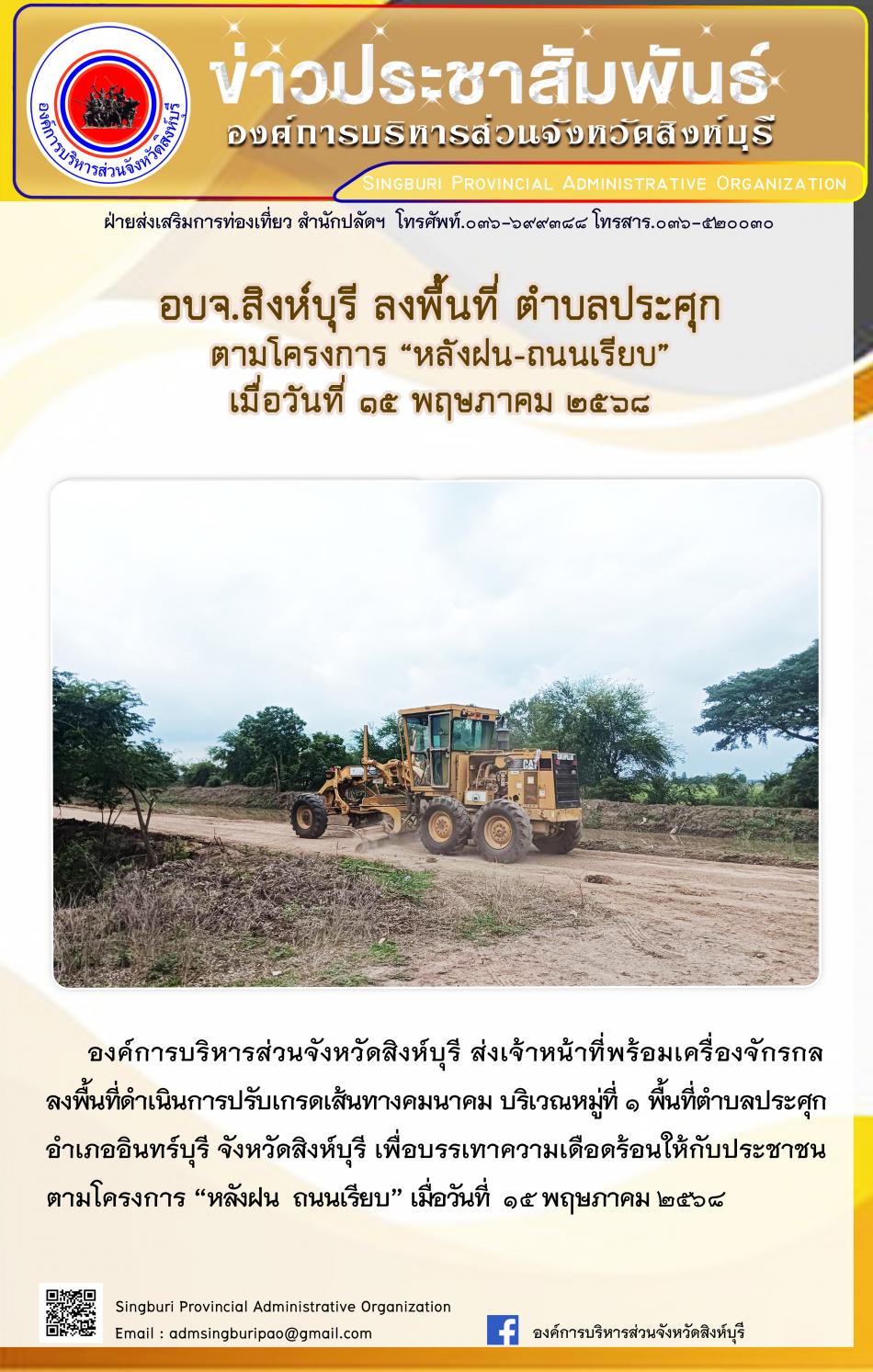 อบจ.สิงห์บุรี ลงพื้นที่ ตำบลประศุก ตามโครงการ "หลังฝน - ถนนเรียบ" [15 พฤษภาคม 2568]