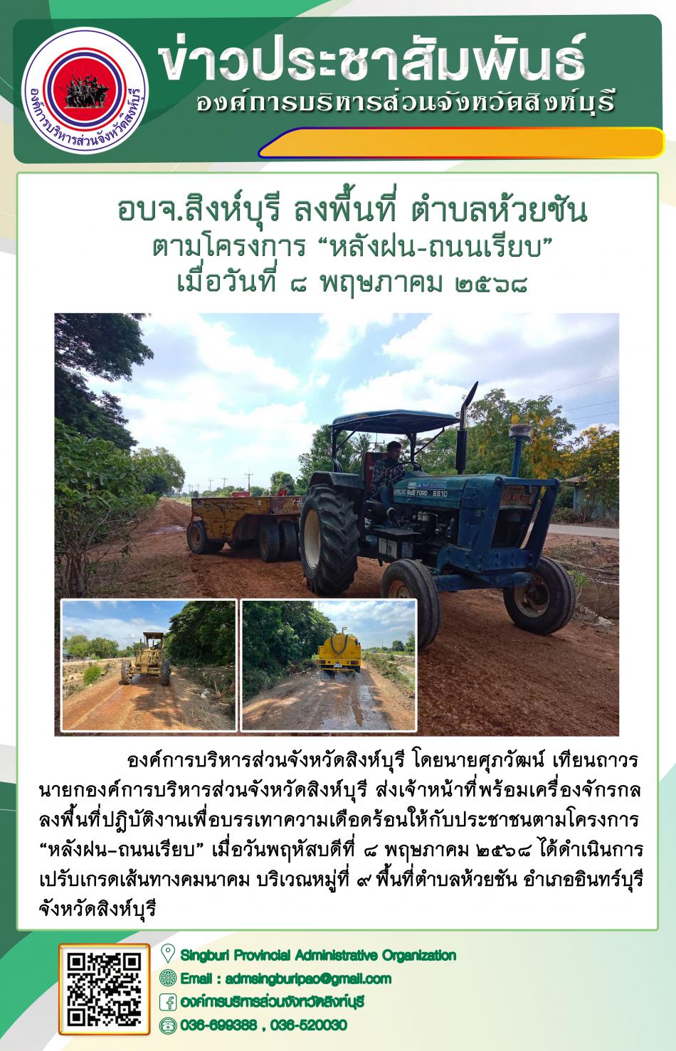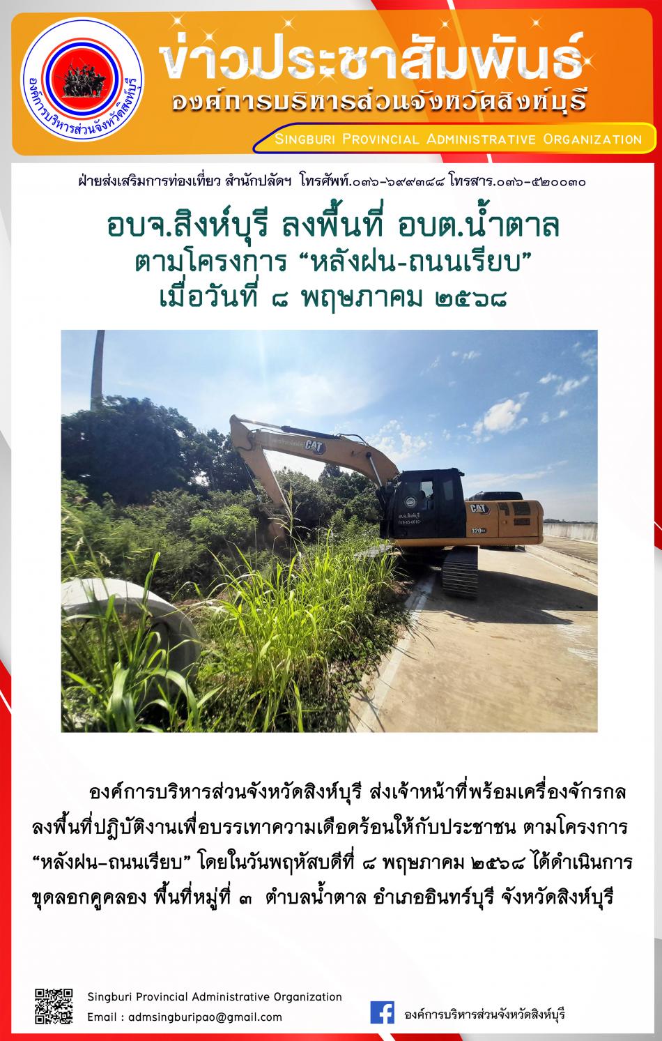 อบจ.สิงห์บุรี ลงพื้นที่ อบตห้วยชัน ตามโครงการ "หลังฝน - ถนนเรียบ" [8 พฤษภาคม 2568]