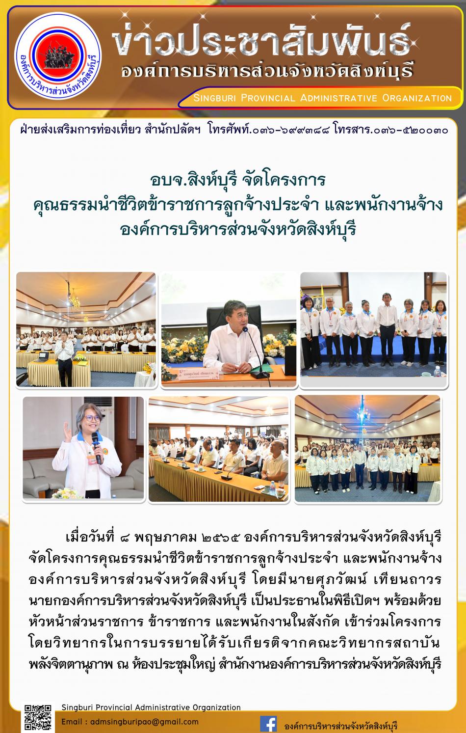 อบจ.สิงห์บุรี จัดโครงการคุณธรรมนำชีวิตข้าราชการลูกจ้างประจำ และพนักงานจ้างองค์การบริหารส่วนจังหวัดสิงห์บุรี [8 พฤษภาคม 2568]