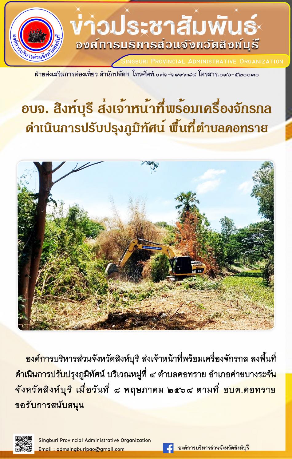 อบจ.สิงห์บุรี ส่งเจ้าหน้าที่พร้อมเครื่องจักรกล ดำเนินการปรับปรุงภูมิทัศน์ พื้นที่ตำบลคอทราย [8 พฤษภาคม 2568]