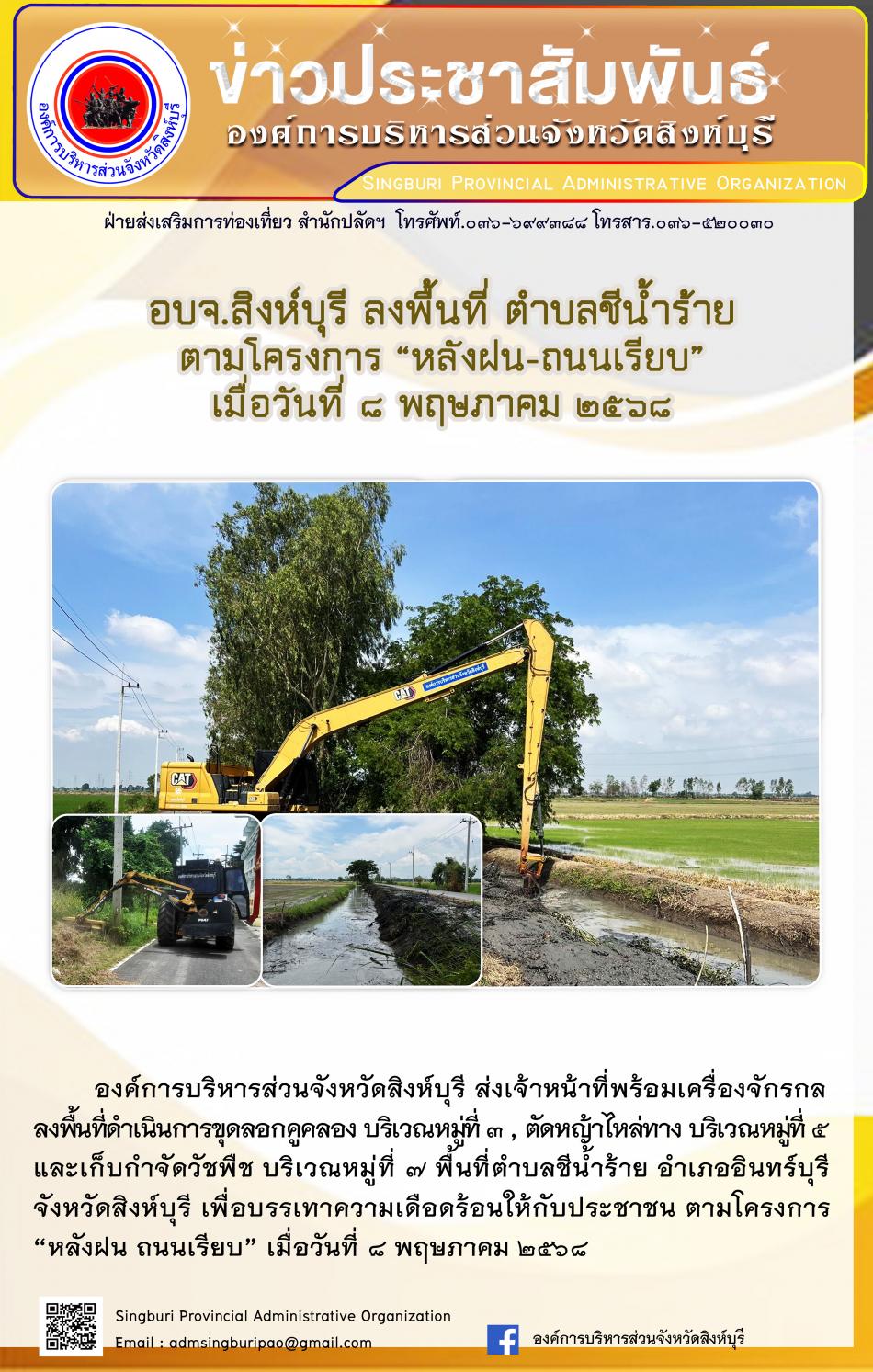 อบจ.สิงห์บุรี ลงพื้นที่ ตำบลโพธิ์ชัย ตามโครงการ "หลังฝน - ถนนเรียบ" [8 พฤษภาคม 2568]