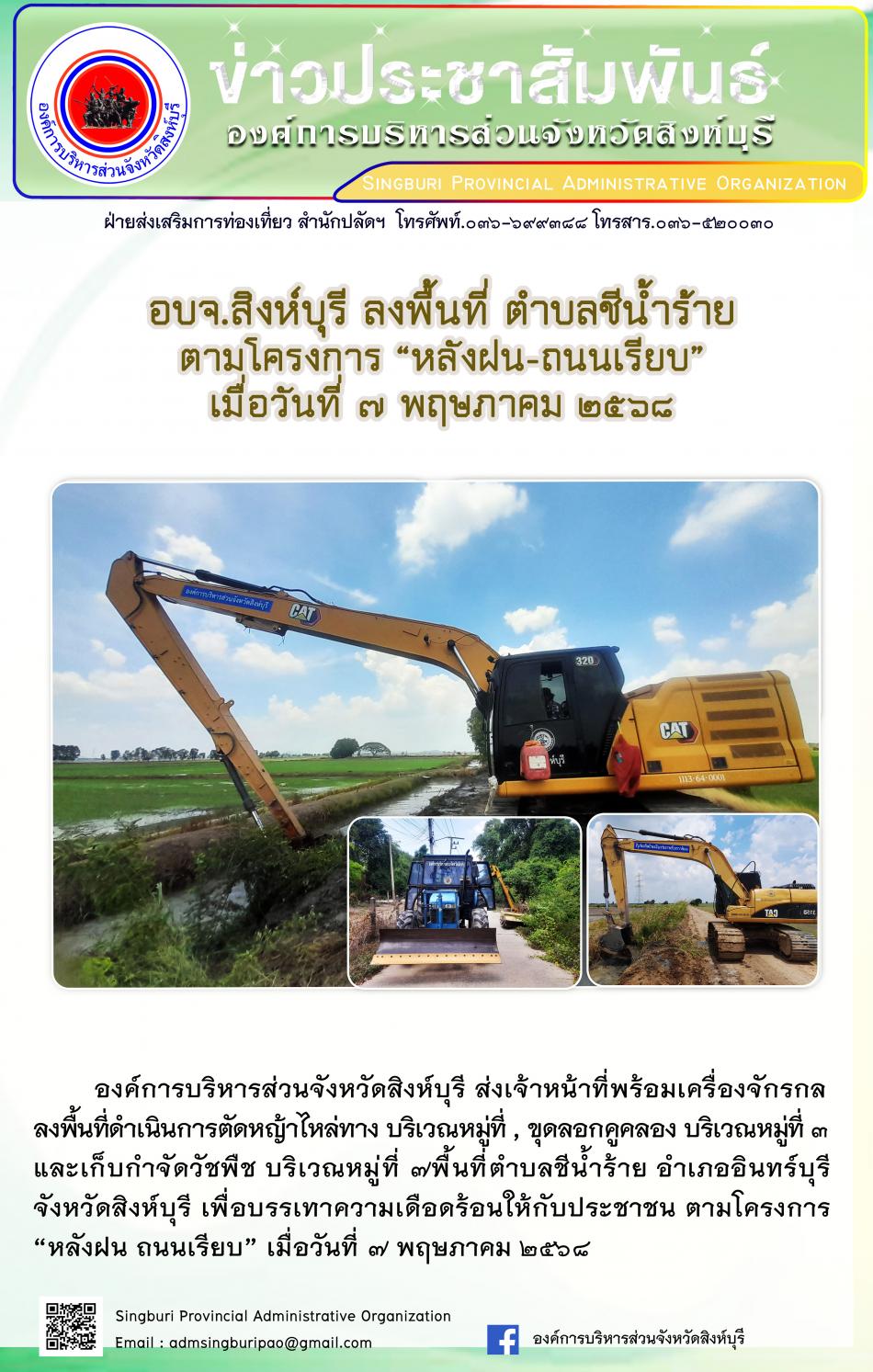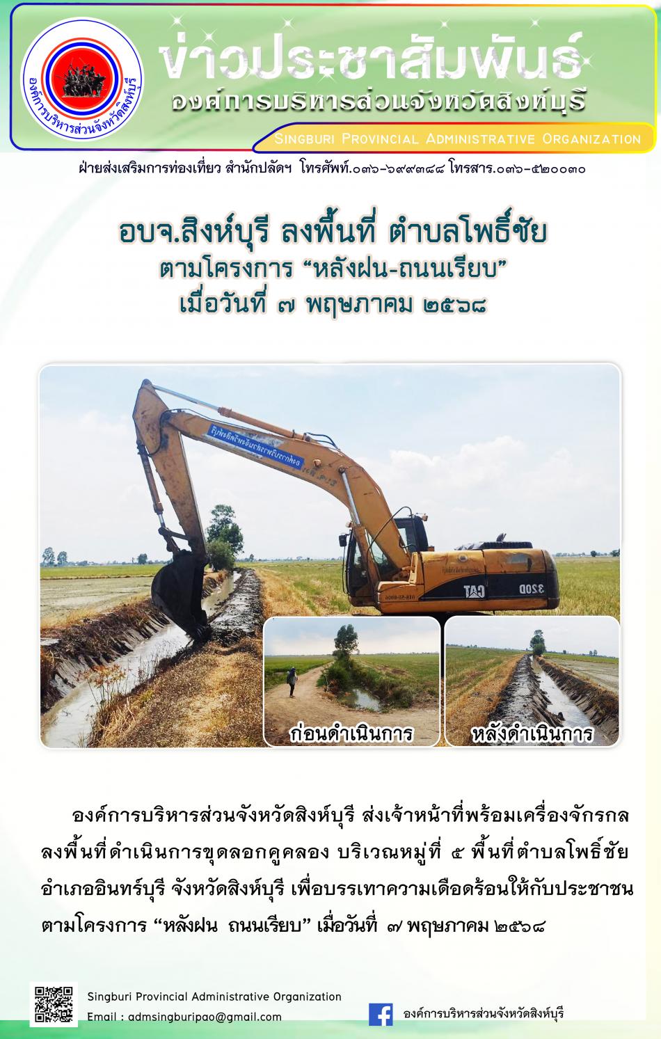 อบจ.สิงห์บุรี ลงพื้นที่ ตำบลโพธิ์ชัย ตามโครงการ "หลังฝน - ถนนเรียบ" [7 พฤษภาคม 2568]