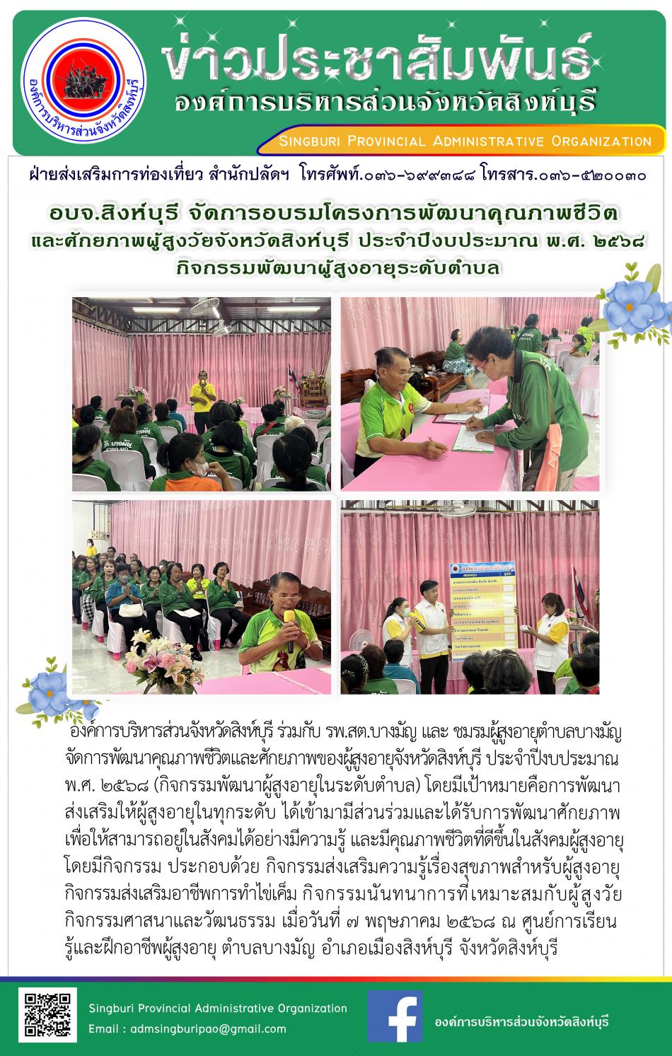 อบจ.สิงห์บุรี จัดการอบรมโครงการพัฒนาคุณภาพชีวิต และศักยภาพผู้สูงวัยจังหวัดสิงห์บุรี ประจำปีงบประมาณ พ.ศ.2568 กิจกรรมพัฒนาผู้สูงอายุระดับตำบล [7 พฤษภาคม 2568]