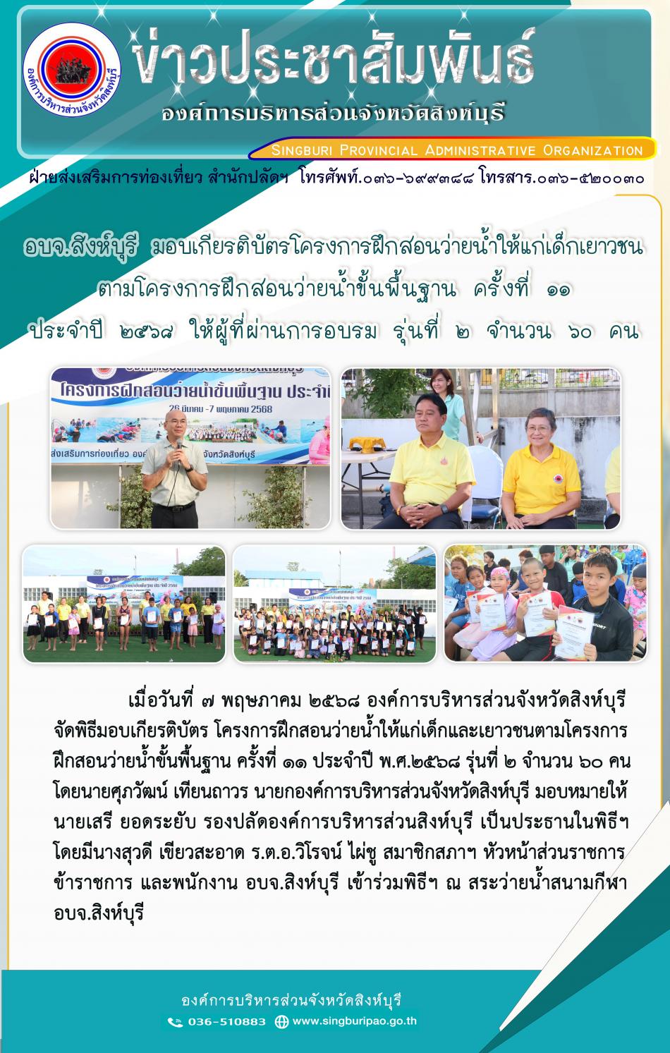 อบจ.สิงห์บุรี มอบเกียรติบัตรโครงการฝึกสอนว่ายน้ำให้แก่เด็กและเยาวชน ตามโครงการฝึกสอนว่ายน้ำขึ้นพื้นฐาน ครั้งที่ 11 ประจำปี 2568 ให้ผู้ที่ผ่านการอบรม รุ่นที่ 2 จำนวน 60 คน [7 พฤษภาคม 2568]