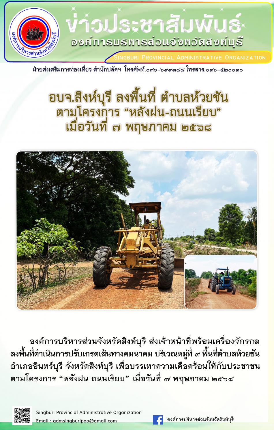 อบจ.สิงห์บุรี ลงพื้นที่ ตำบลห้วยชัน ตามโครงการ "หลังฝน - ถนนเรียบ" [7 พฤษภาคม 2568]