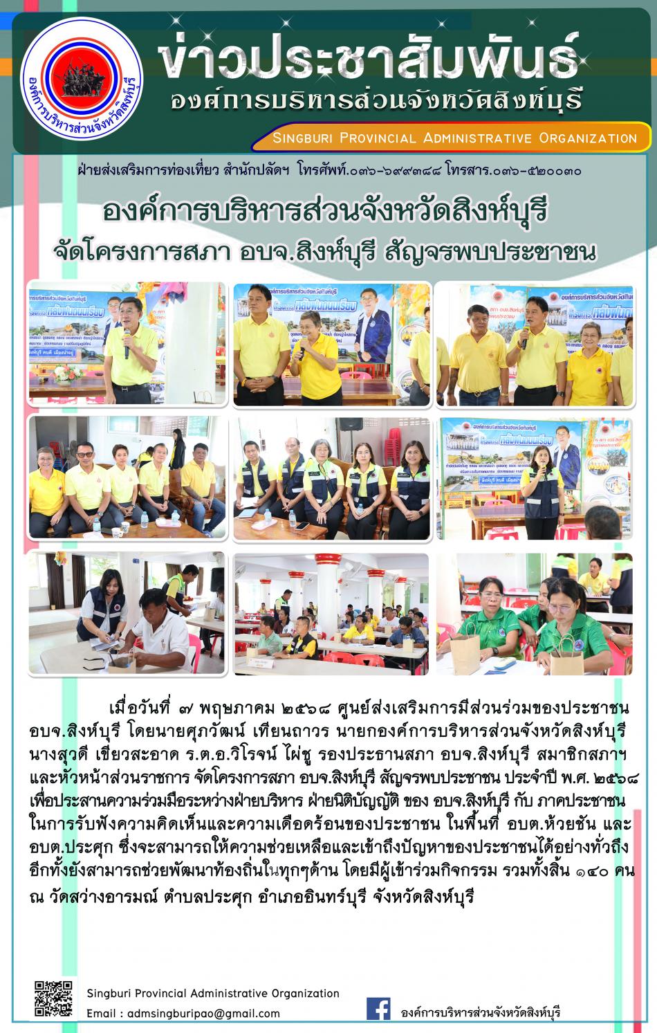 องค์การบริหารส่วนจังหวัดสิงห์บุรี จัดโครงการสภา อบจ.สิงห์บุรี สัญจรพบประชาชน [7 พฤษภาคม 2568]