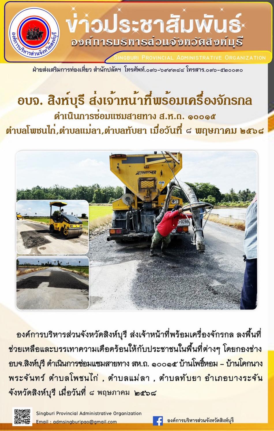 อบจ.สิงห์บุรี ส่งเจ้าหน้าที่พร้อมเครื่องจักรกล ดำเนินการซ่อมแซมสายทาง ส.ห.ถ.10015 ตำบลโพชนไก่ ,ตำบลแม่ลา . ตำบลทับยา [8 พฤษภาคม 2568]