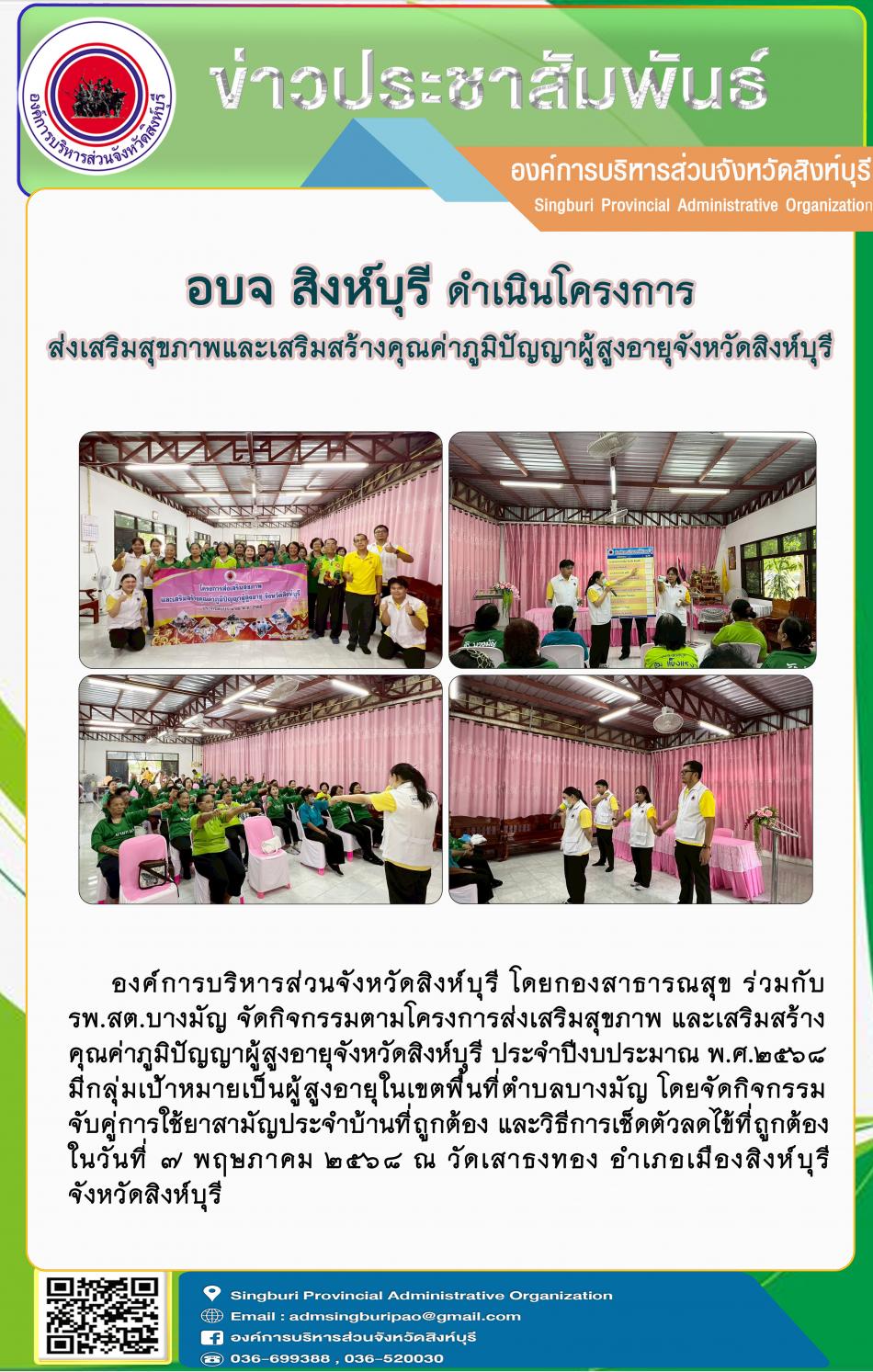 อบจ.สิงห์บุรี ดำเนินโครงการส่งเสริมสร้างสุขภาพและเสริมคุณค่าภูมิปัญญาผู้สูงอายุจังหวัดสิงห์บุรี [7 พฤษภาคม 2568]
