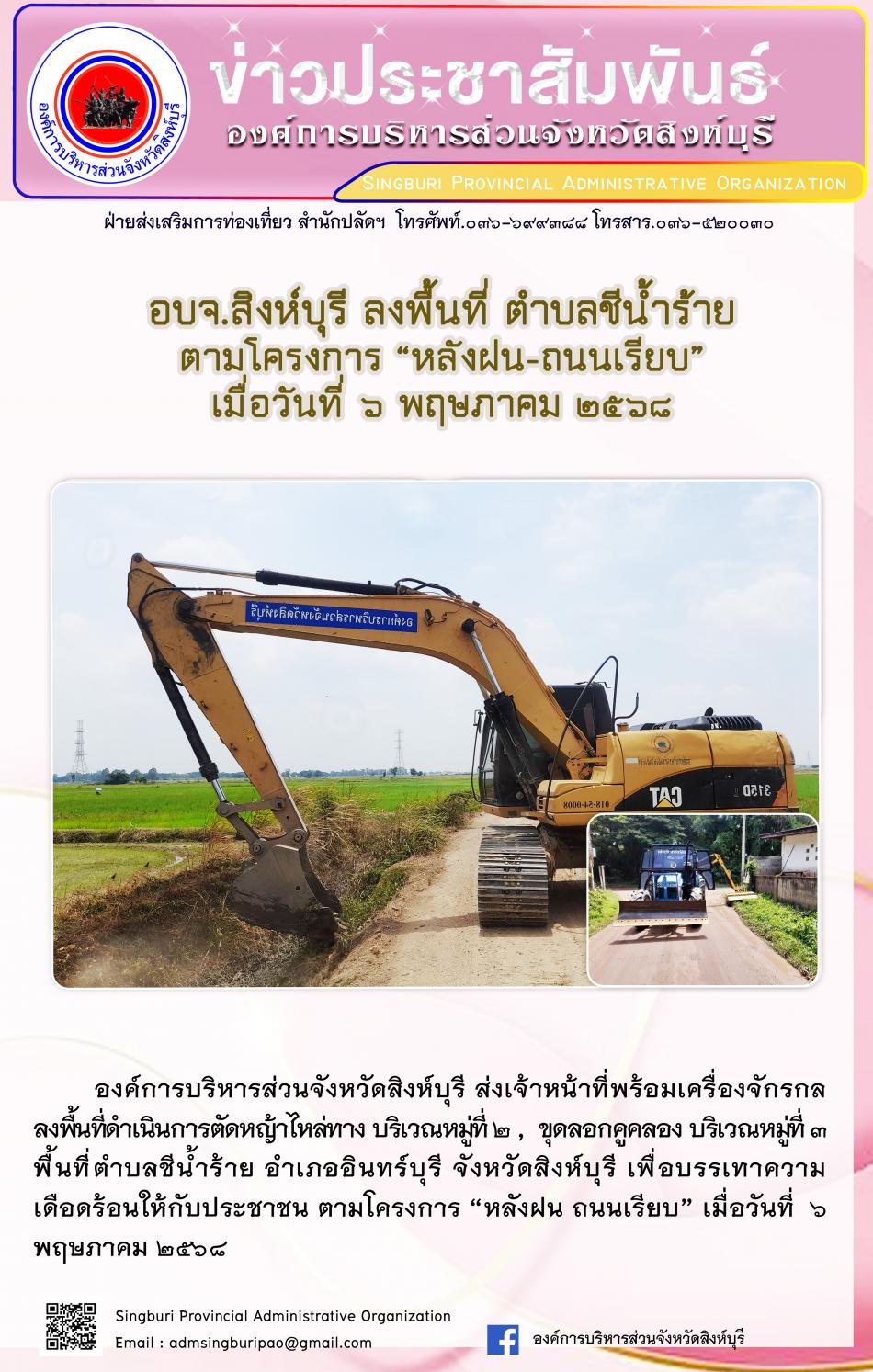 อบจ.สิงห์บุรี ลงพื้นที่ ตำบลชีน้ำราย ตามโครงการ "หลังฝน - ถนนเรียบ" [6 พฤษภาคม 2568]