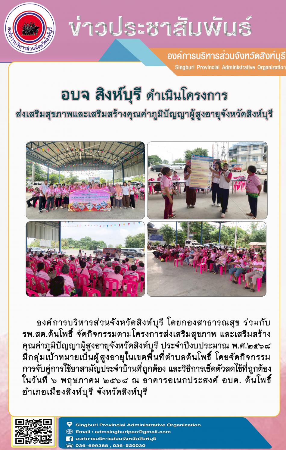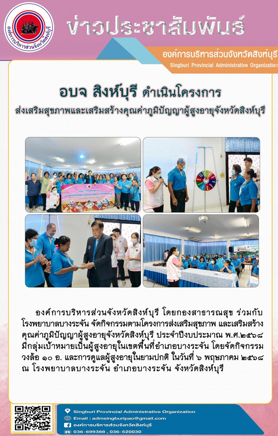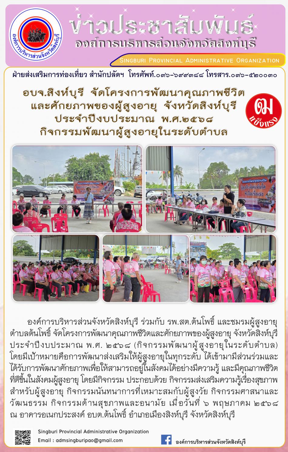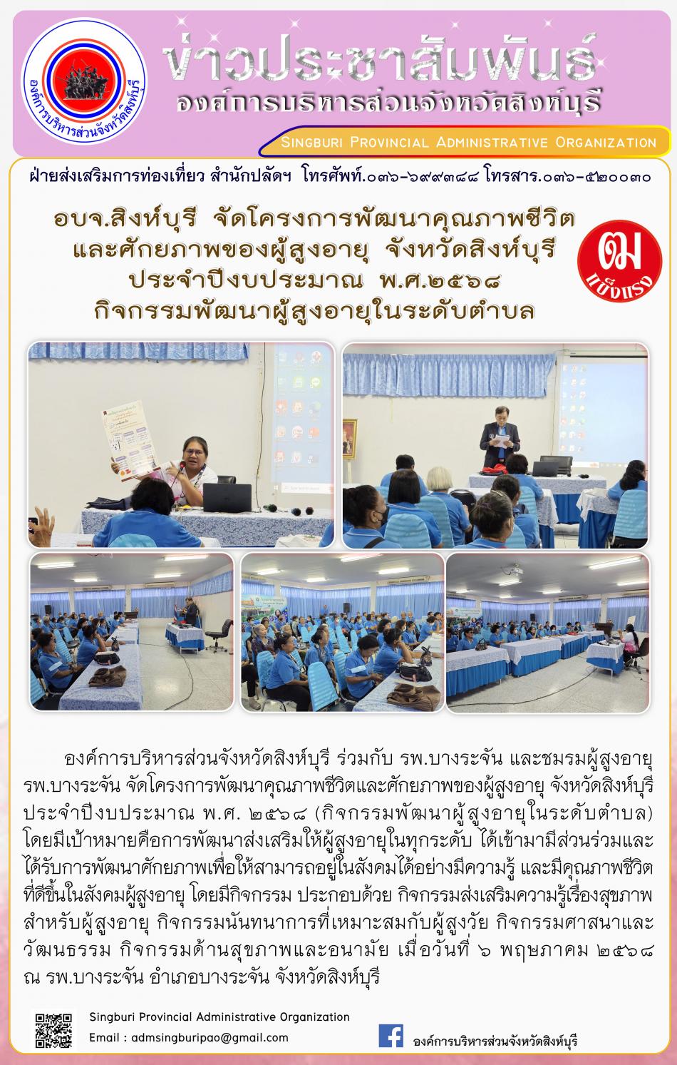 อบจ.สิงห์บุรี จัดโครงการพัฒนาคุณภาพชีวิตและศักยภาพของผู้สูงอายุ จังหวัดสิงห์บุรี ประจำปีงบประมาณ พ.ศ.2568 กิจกรรมพัฒนาผู้สูงอายุในระดับตำบล [6 พฤษภาคม 2568]