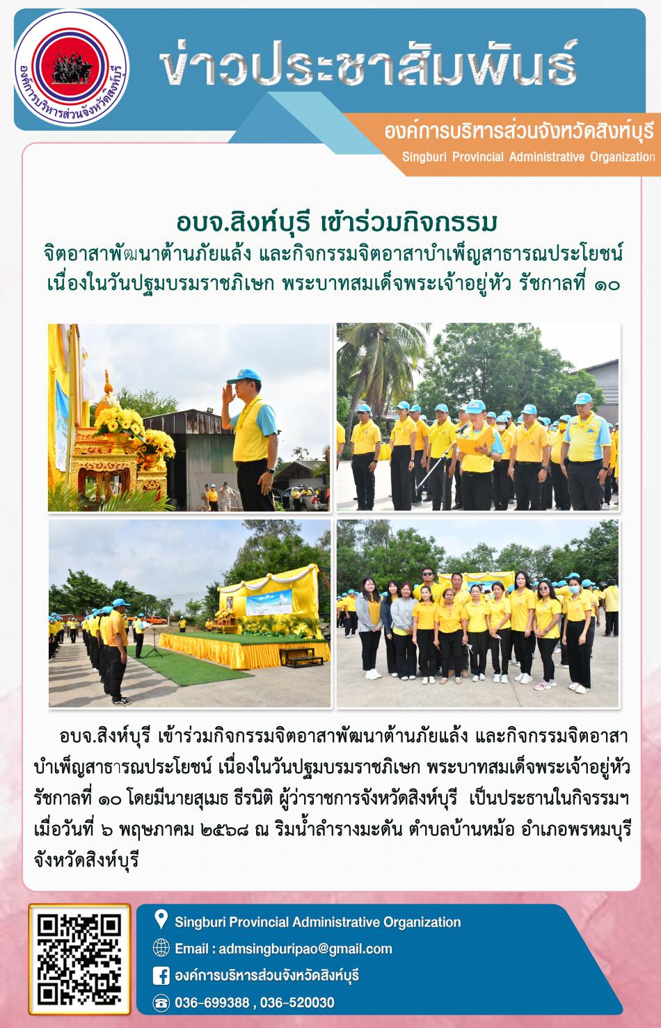 อบจ.สิงห์บุรี เข้าร่วมกิจกรรมจิตอาสาพัฒนาด้านภัยแล้ง และกิจกรรมจิตอาสาบำเพ็ญสาธารณประโยชน์ เนื่องในวันปฐมบรมราชภิเษก พระบาทสมเด็จพระเจ้าอยู่หัว รัชกาลที่ 10 [6 พฤษภาคม 2568]