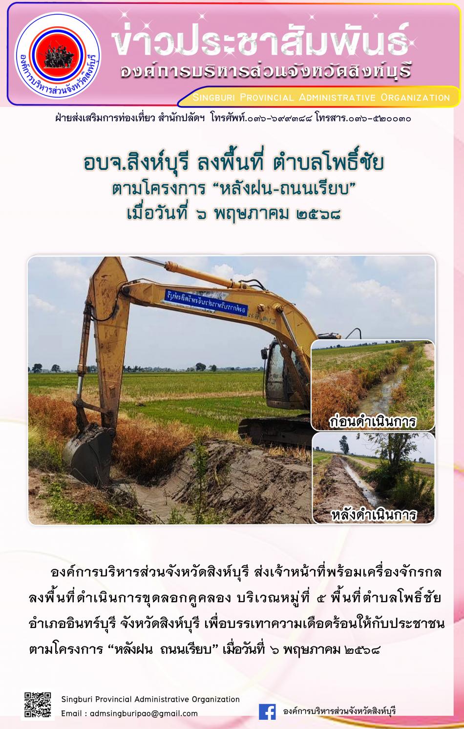 อบจ.สิงห์บุรี ลงพื้นที่ อบต.ตำบลโพธิ์ชัย ตามโครงการ "หลังฝน - ถนนเรียบ" [6 พฤษภาคม 2568]