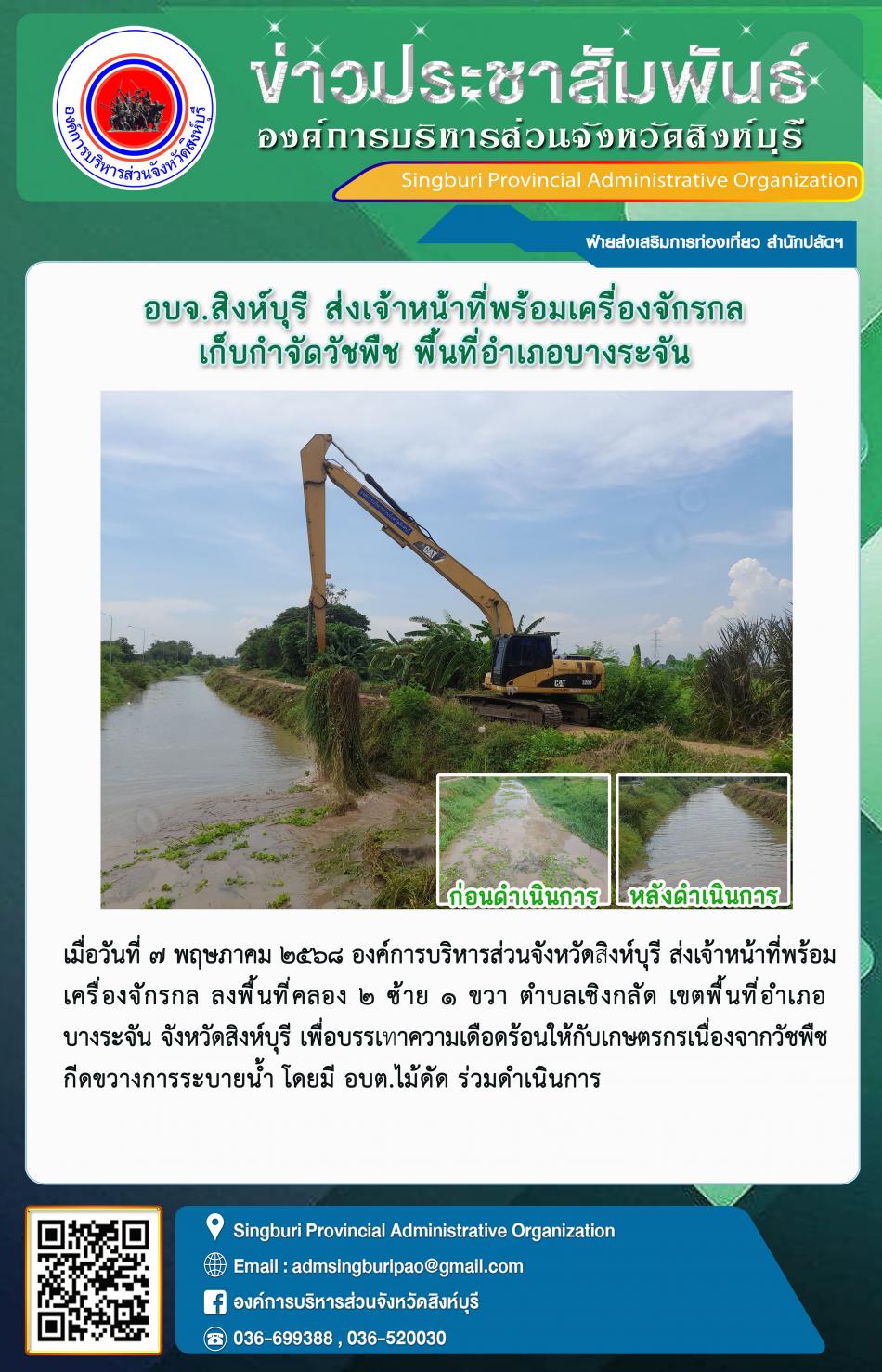 อบจ.สิงห์บุรี ส่งเจ้าหน้าที่พร้อมเครื่องจักรกล เก็บกำจัดวัชพืช พื้นที่อำเภอบางระจัน [7 พฤษภาคม 2568]