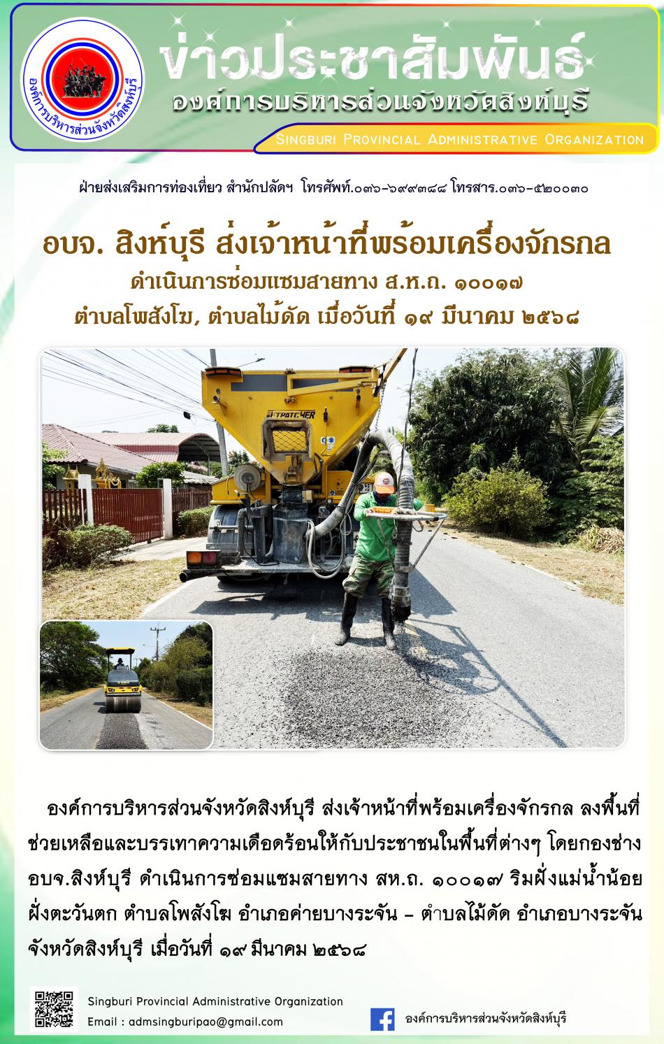อบจ.สิงห์บุรี ส่งเจ้าหน้าที่พร้อมเครื่องจักรกล ดำเนินการซ่อมแซมสายทาง ส.ห.ถ.10017 ตำบลโพสังโฆ ตำบลไม้ดัด [19 มีนาคม 2568]