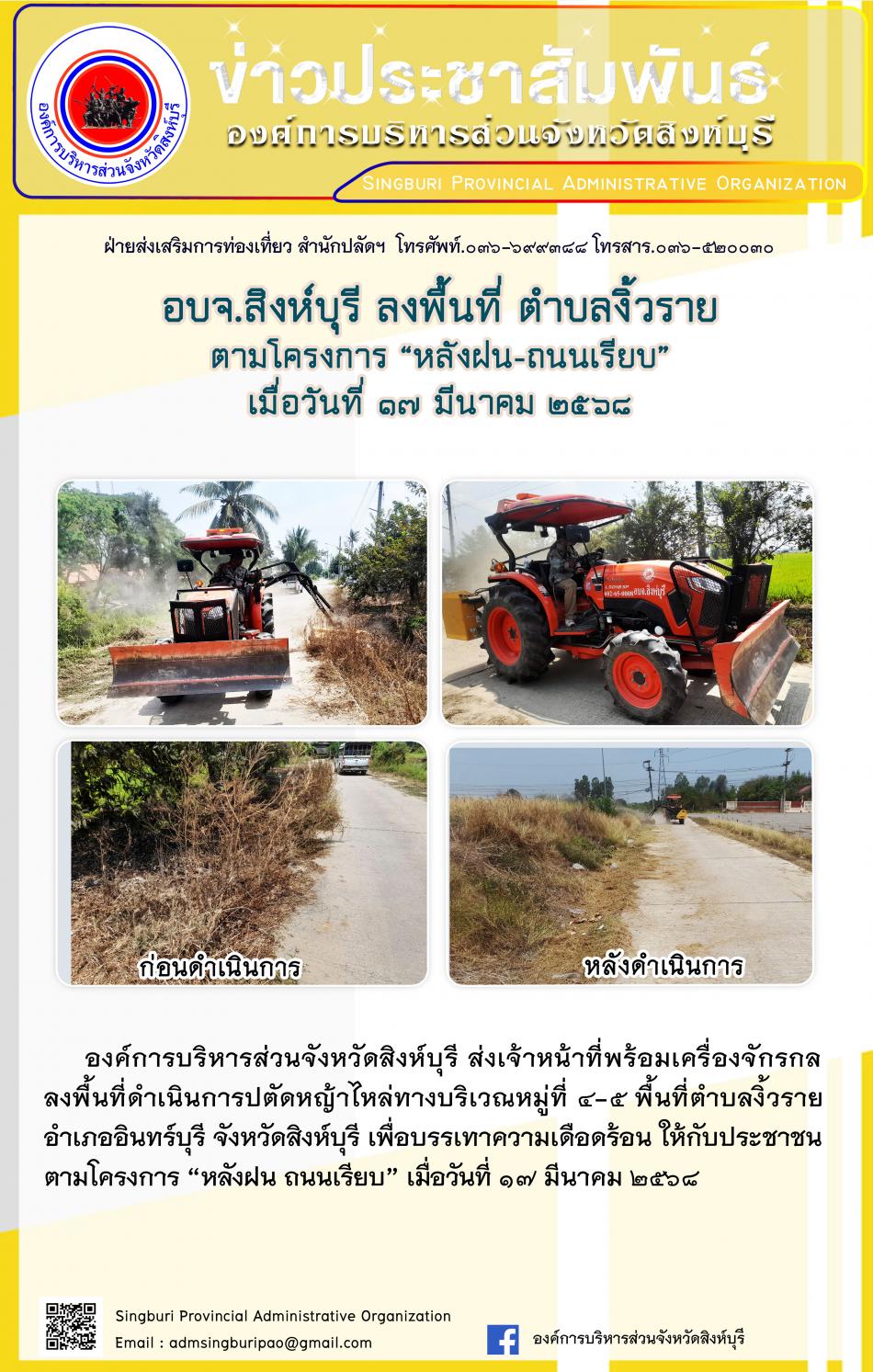 อบจ.สิงห์บุรี ลงพื้นที่ ตำบลงิ้วราย ตามโครงการ "หลังฝน - ถนนเรียบ" [17 มีนาคม 2568]
