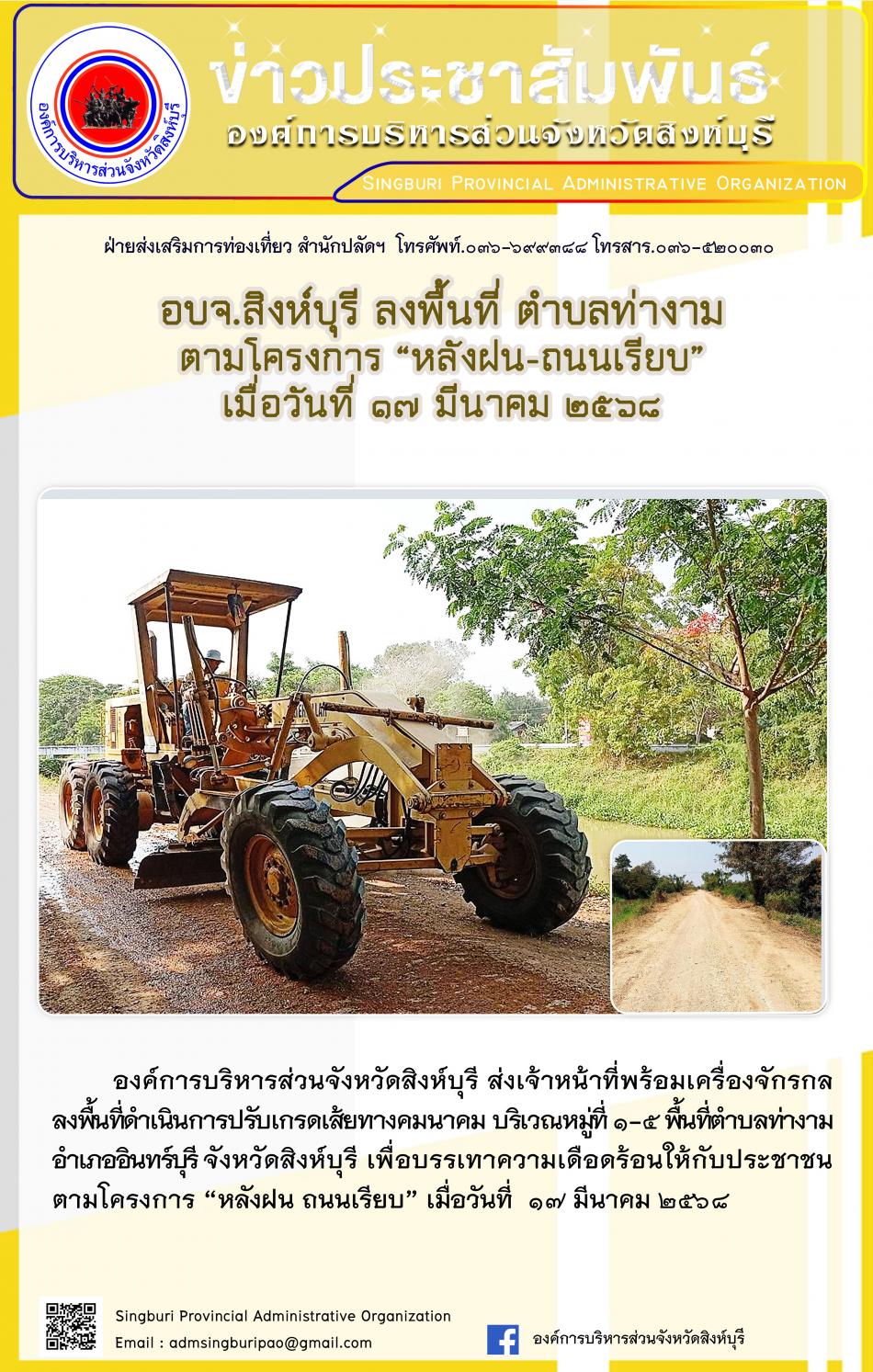 อบจ.สิงห์บุรี ลงพื้นที่ ตำบลท่างาม ตามโครงการ "หลังฝน - ถนนเรียบ" [17 มีนาคม 2568]
