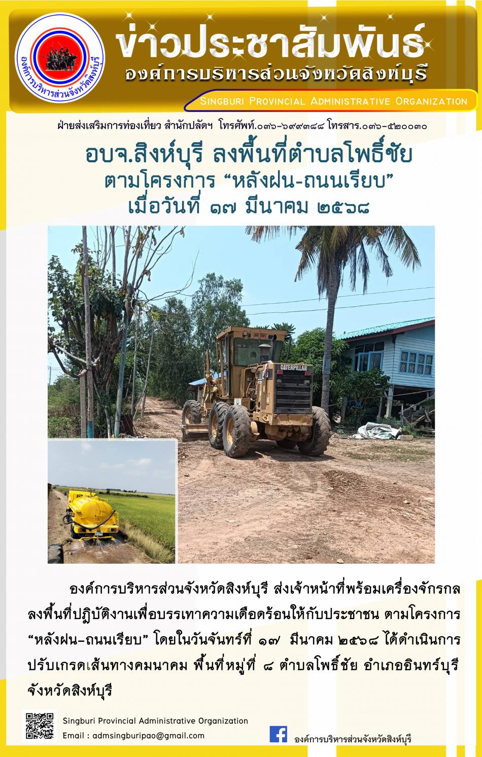 อบจ.สิงห์บุรี ลงพื้นที่ ตำบลโพธิ์ชัย ตามโครงการ "หลังฝน - ถนนเรียบ" [17 มีนาคม 2568]