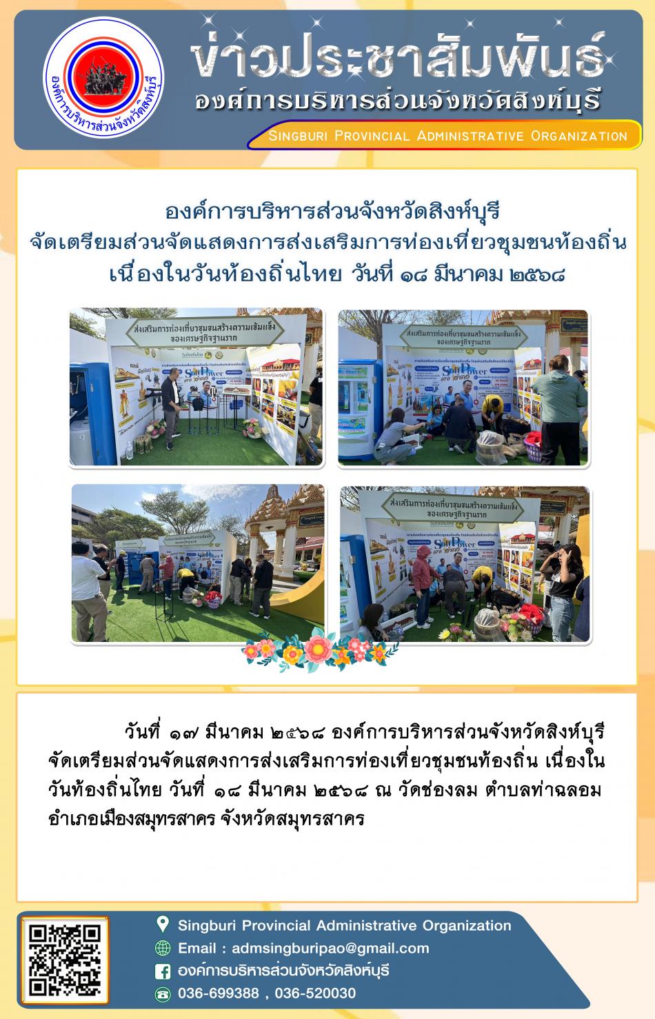 องค์การบริหารส่วนจังหวัดสิงห์บุรี จัดเตรียมส่วนจัดแสดงการส่งเสริมการท่องเที่ยวชุมชนท้องถิ่น เนื่องในวันท้องถิ่นไทย [17 มีนาคม 2568]