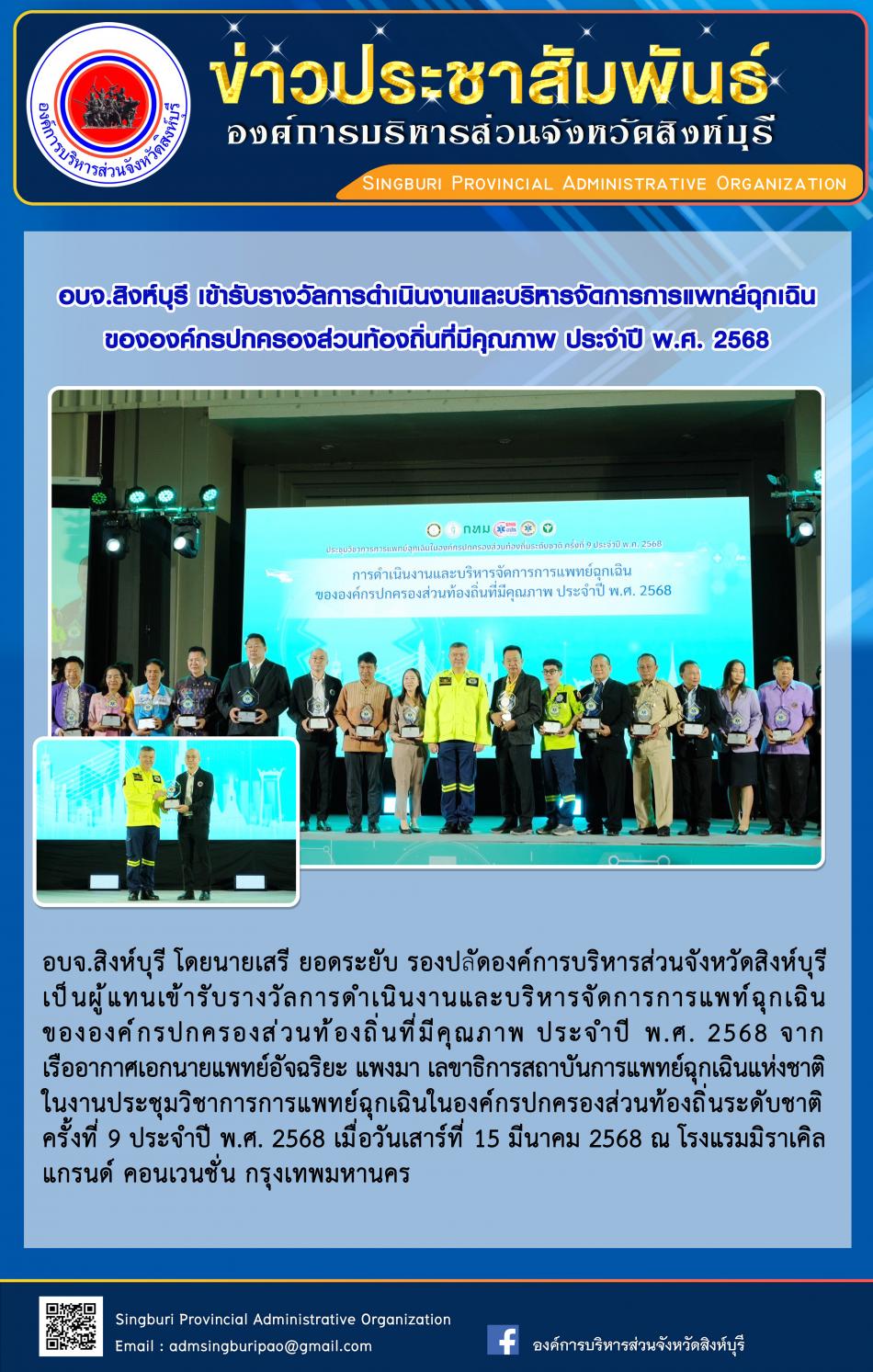 อบจ.สิงห์บุรี เข้ารับรางวัลการดำเนินงานและบริหารจัดการแพทย์ฉุกเฉินขององค์กรปกครองส่วนท้องถิ่นที่มีคุณภาพ ประจำปี พ.ศ.2568 [15 มีนาคม 2568]