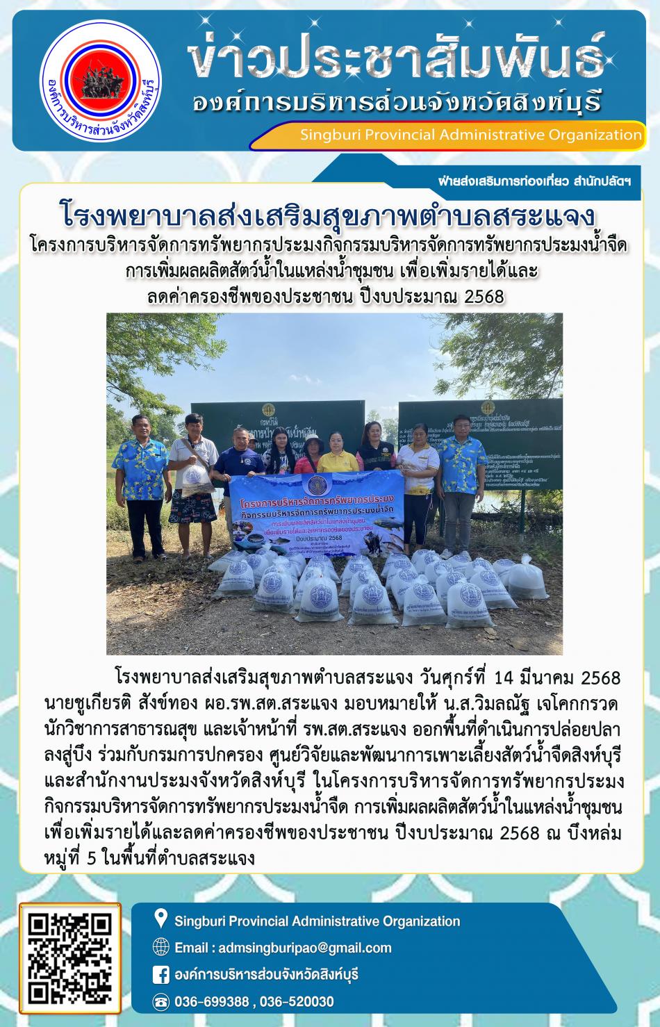 โรงพยาบาลส่งเสริมสุขภาพตำบลสระแจง โครงการบริหารจัดการทรัพยากรประมงกิจกรรมบริหารจัดการทรัพยากรประมงน้ำจืด การเพิ่มผลผลิตสวัตน์น้ำในแหล่งน้ำชุมชน เพื่อเพิ่มรายได้และลดค่าครองชีพของประชาชน ปีงบประมาณ 2568 [14 มีนาคม 2568]