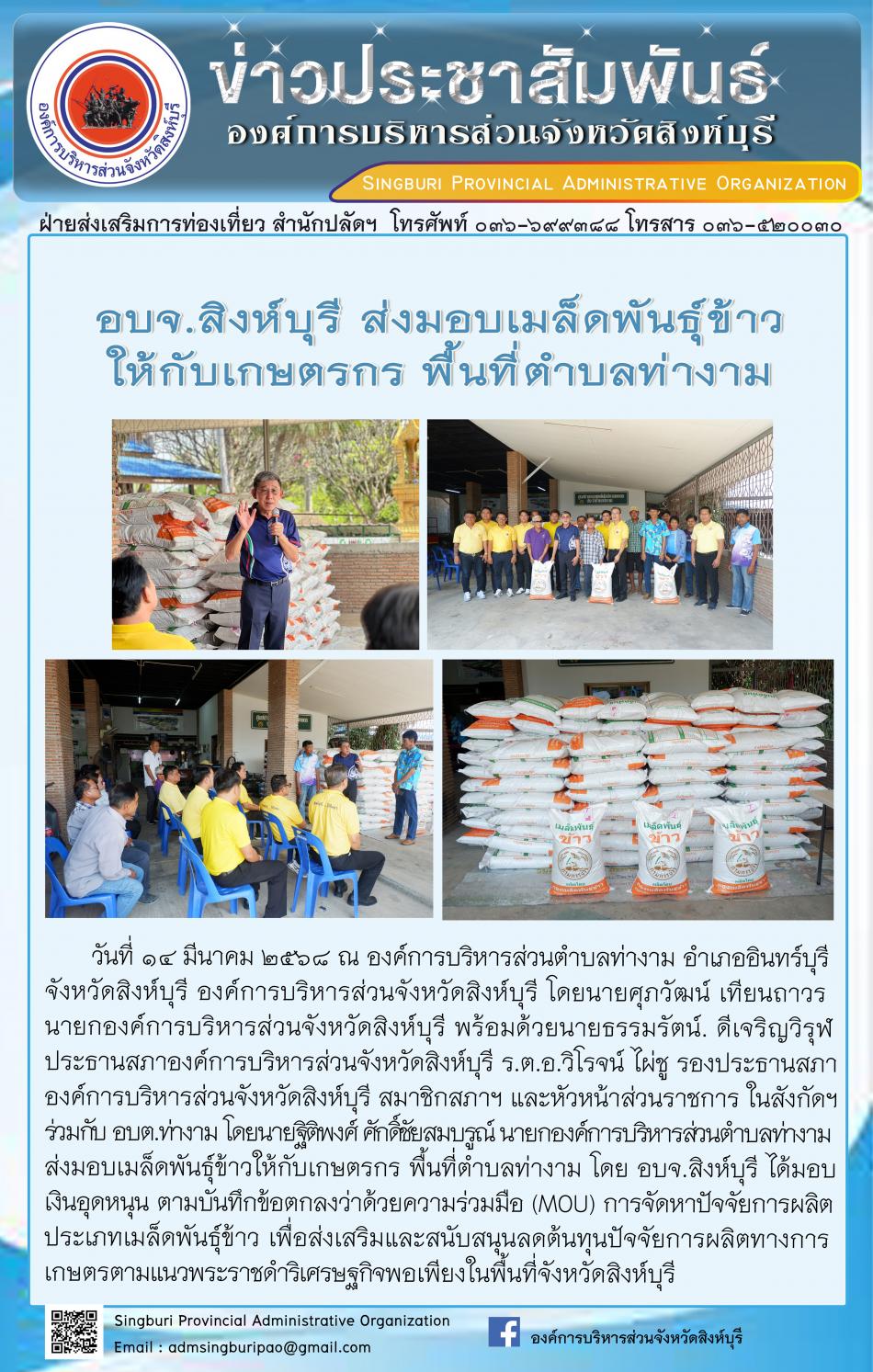 อบจ.สิงห์บุรี ส่งมอบเมล็ดพันธ์ข้าวให้กับเกษตรกร พื้นที่ตำบลท่างาม [14 มีนาคม 2568]
