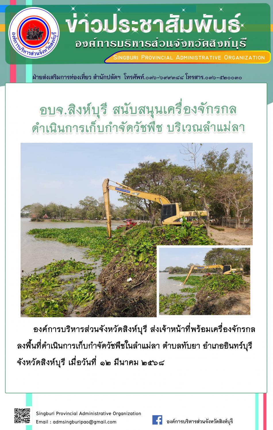 อบจ.สิงห์บุรี ส่งเจ้าหน้าที่พร้อมเครื่องจักรกล เก็บกำจัดวัชพืช บริเวณลำแม่ลา [12 มีนาคม 2568]