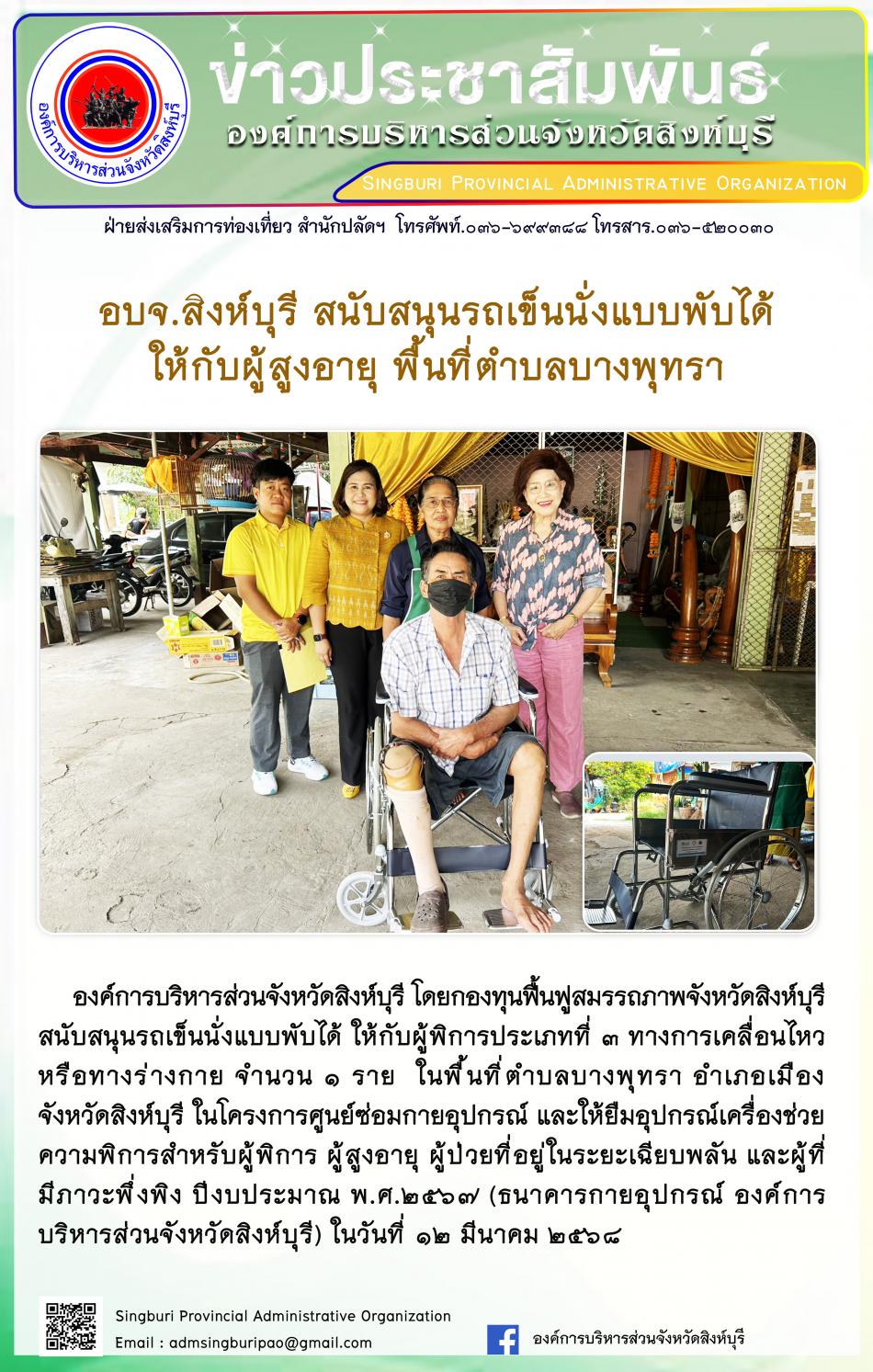 อบจ.สิงห์บุรี สนับสนุนรถเข็นนั่งแบบพับได้ ให้กับผู้สูงอายุ พื้นที่ตำบลบางพุทรา [12 มีนาคม 2568]