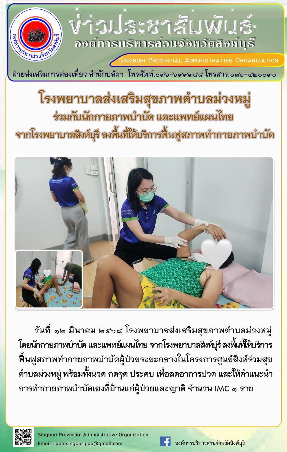 โรงพยาบาลส่งเสริมสุขภาพตำบลม่วงหมู่ ร่วมกับนักกายภาพบำบัด และแพทย์แผนไทย จากโรงพยาบาลสิงห์บุรี ลงพื้นที่ให้บริการฟื้นฟูสภาพทำกายภาพบำบัด [12 มีนาคม 2568]