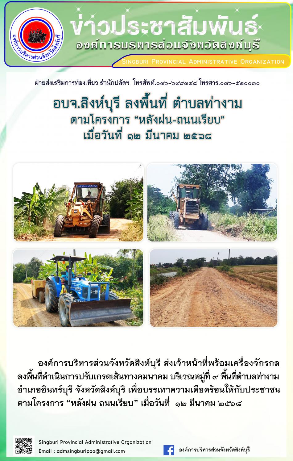 อบจ.สิงห์บุรี ลงพื้นที่ ตำบลท่างาม ตามโครงการ "หลังฝน - ถนนเรียบ" [12 มีนาคม 2568]