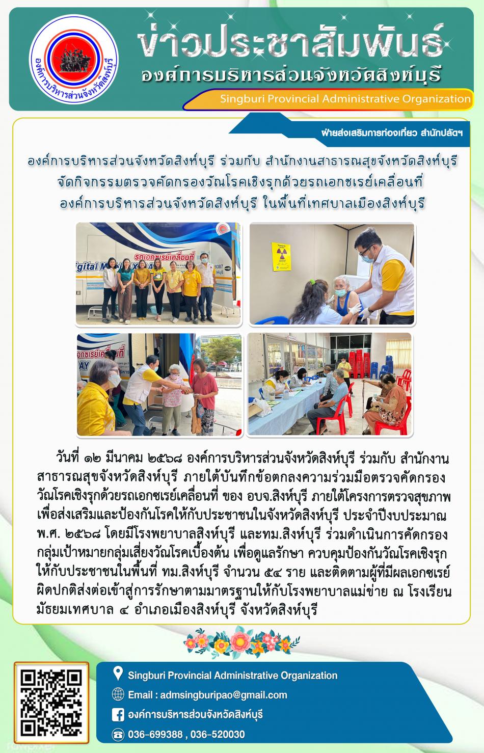องค์การบริหารส่วนจังหวัดสิงห์บุรี ร่วมกับสาธาณสุขจังหวัดสิงห์บุรี จัดกิจกรรมตรวจคัดกรองวัณโรคเชิงรุกด้วยรถเอกซเรย์เคลื่อนที่ องค์การบริหารส่วนจังหวัดสิงห์บุรี ในพื้นที่เทศบาลเมืองสิงห์บุรี [12 มีนาคม 2568]