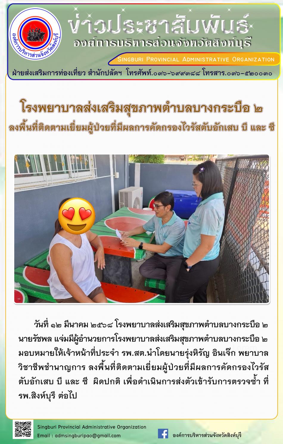 โรงพยาบาลส่งเสริมสุขภาพตำบลบางกระบือ2 ลงพื้นที่ติดตามเยี่ยมผู้ป่วยที่มีผลการคัดกรองไวรัสตับอักเสบ บี และซี [12 มีนาคม 2568]