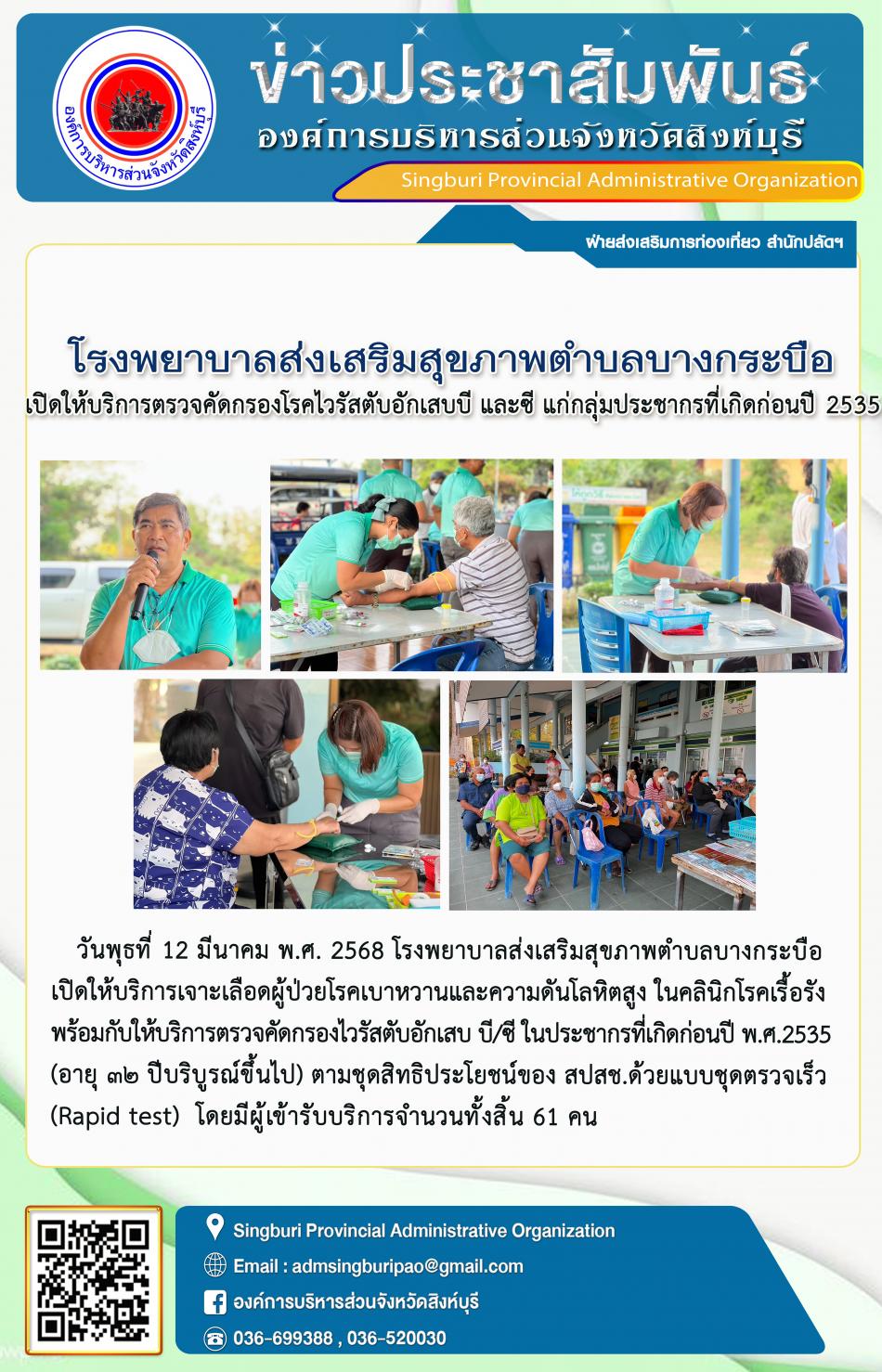 โรงพยาบาลส่งเสริมสุขภาพตำบลบางกระบือ เปิดให้บริการตรวจคัดกรองไวรัสตับอักเสบ บี/ซี ในประชากรที่เกิดก่อนปี พ.ศ. 2535 [12 มีนาคม 2568]