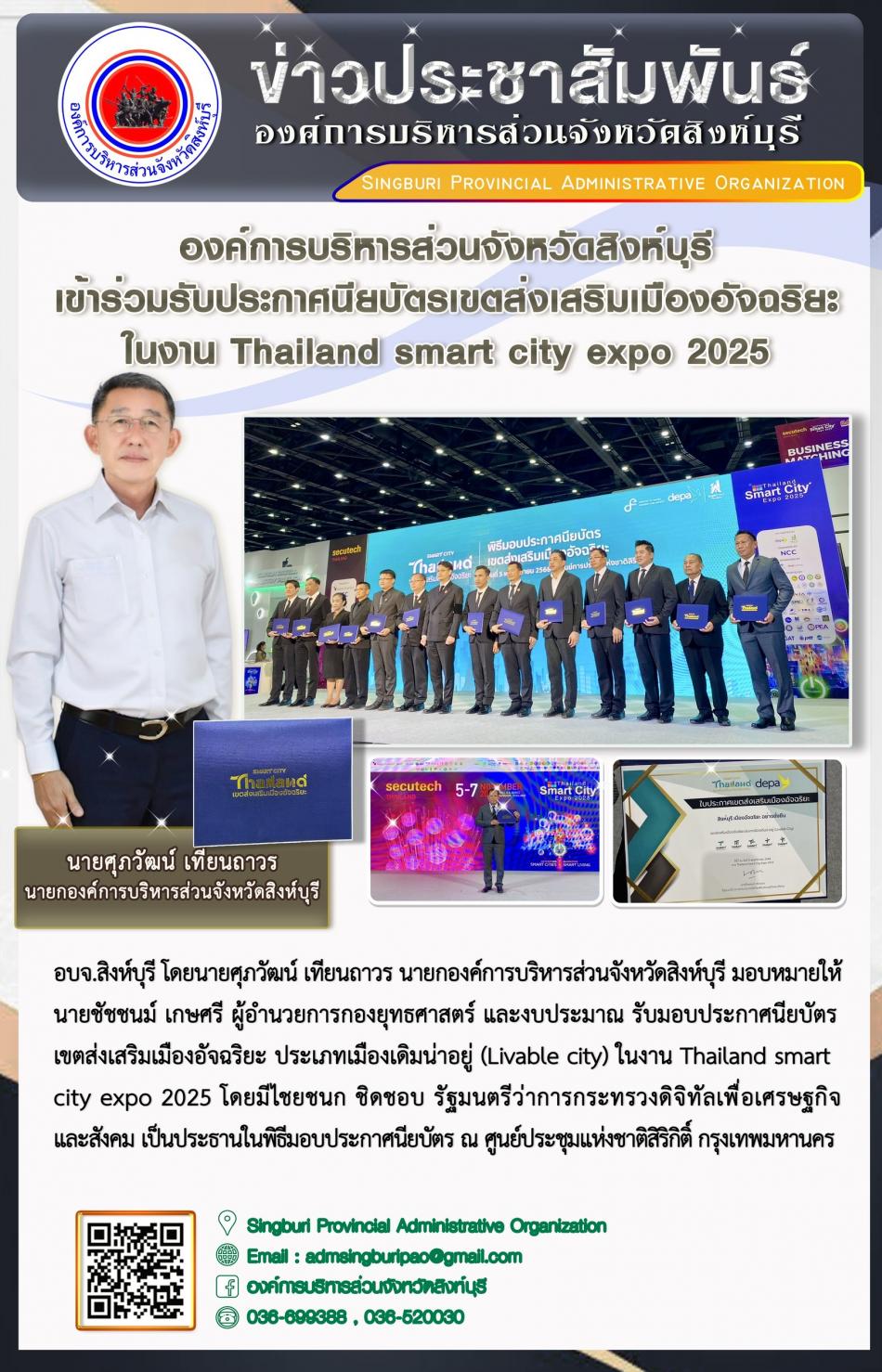 องค์การบริหารส่วนจังหวัดสิงห์บุรี เข้าร่วมรับประกาศนียบัตรเขตส่งเสริมเมืองอัจฉริยะในงาน Thailand smart city expo 2025 [5 พฤศจิกายน 2568]