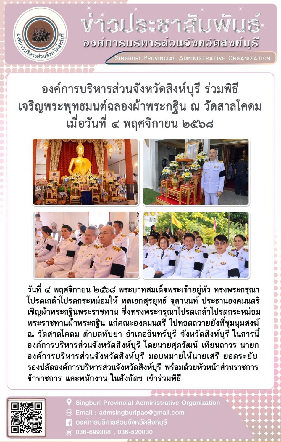 องค์การบริหารส่วนจังหวัดสิงห์บุรีร่วมพิธีเจริญพระพุทธมนต์ฉลองผ้าพระกฐิน ณ วัดสาลโคคม [4 พฤศจิกายน 2568]