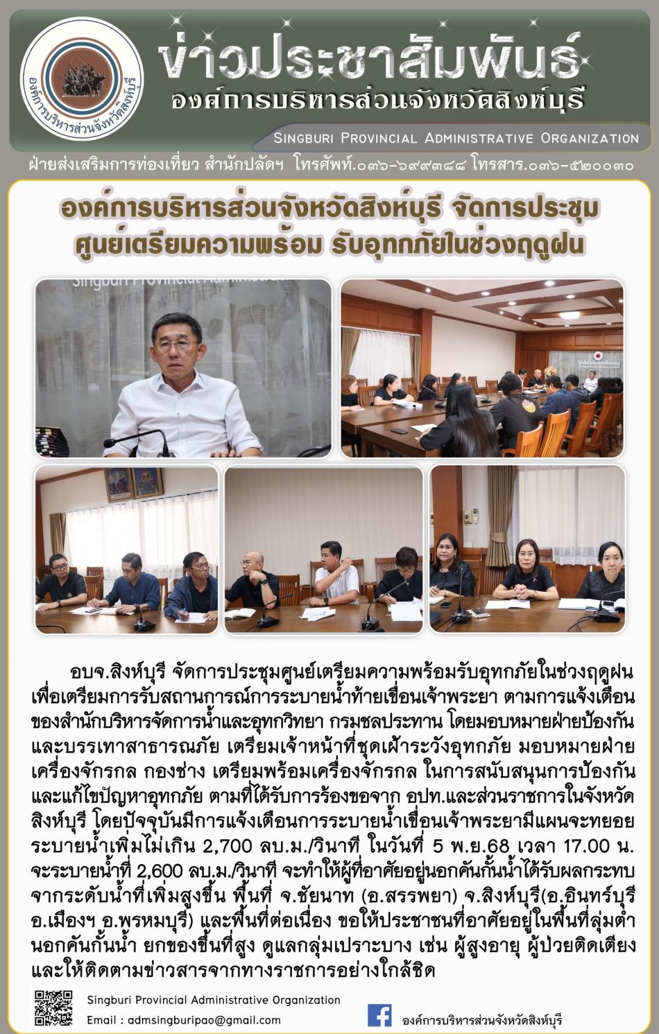 องค์การบริหารส่วนจังหวัดสิงห์บุรี จัดการประชุมศูนย์เตรียมความพร้อม รัมอุทกภัยในช่วงฤดูฝน [5 พฤศจิกายน 2568]