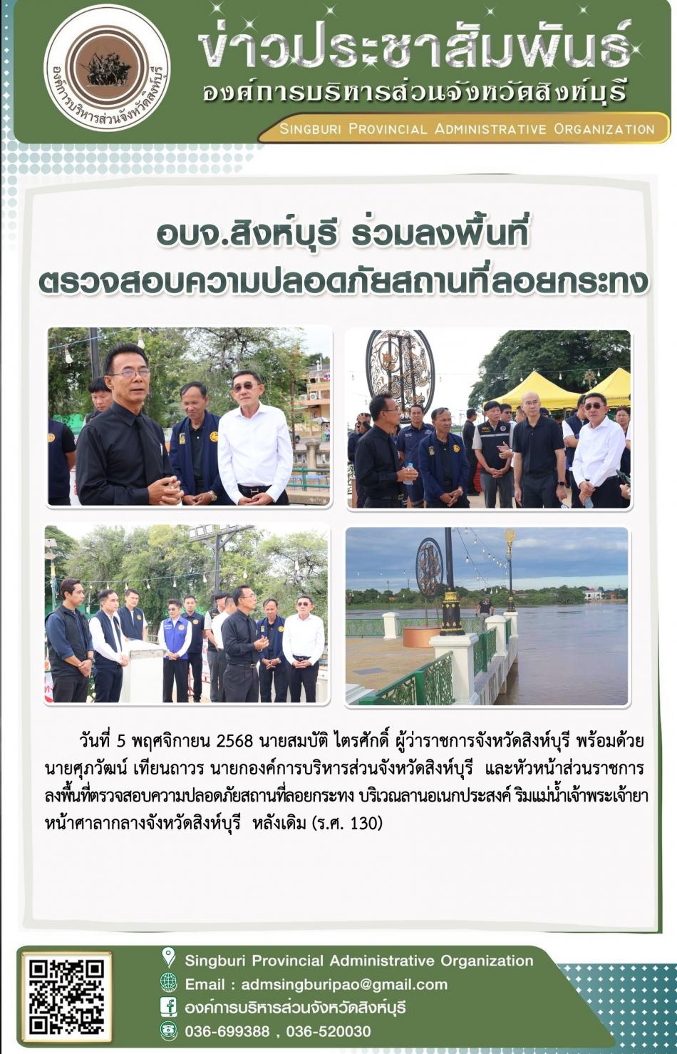 อบจ.สิงห์บุรี ร่วมลงพื้นที่ตรวจสอบความปลอดภัยสถานที่ลอยกระทง [5 พฤศจิกายน 2568]