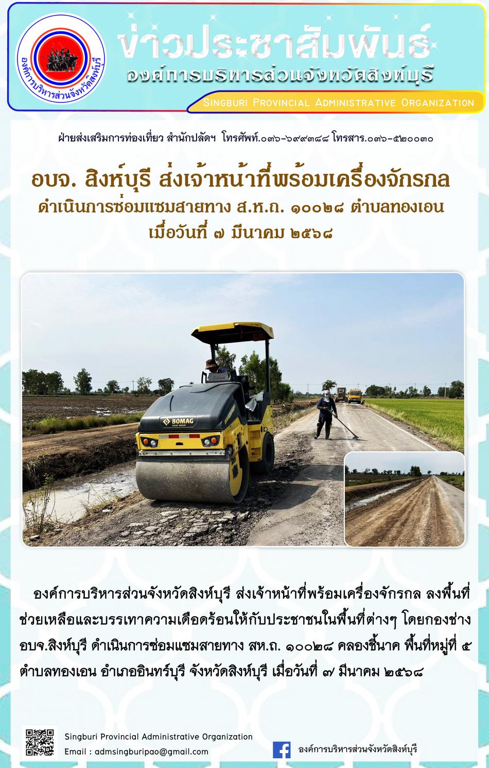 อบจ.สิงห์บุรี ส่งเจ้าหน้าที่พร้อมเครื่องจักรกล ดำเนินการซ่อมแซมสายทาง ส.ห.ถ.10028 ตำบลทองเอน [7 มีนาคม 2568]